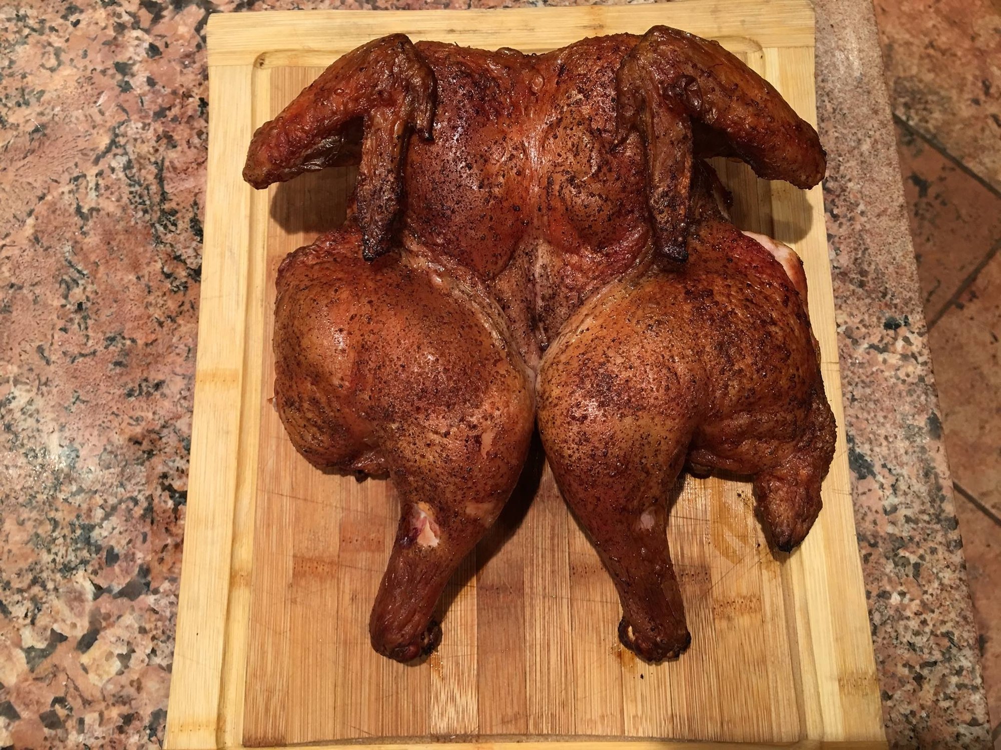 Best one to date. Used an organic chicken. Salt, pepper, duck fat. heated BGE to 500, regulated to 450 after putting chicken on the grill, indirect, 45 minutes. Used cast iron plate setter that may have conducted the lower heat better. Love the maple leaf lump, btw.