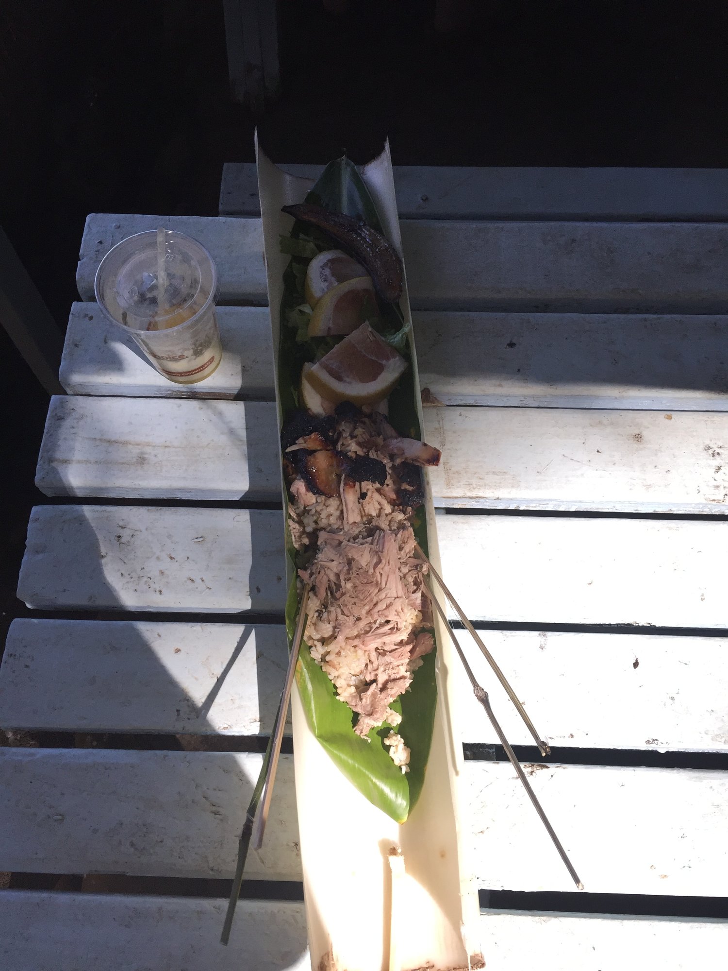 We are in Maui right now and did the Road to Hana Sunday. Stopped at a bbq hut along the side of the road. Was amazing. Pulled pork and chopped chicken. The pork was wrapped with banana leaves while cooking. Gonna try when I get home to find some.