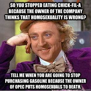 I eat at chikfila because I dont like the taste of gay chickens.Large and Small BGECentral, IL
