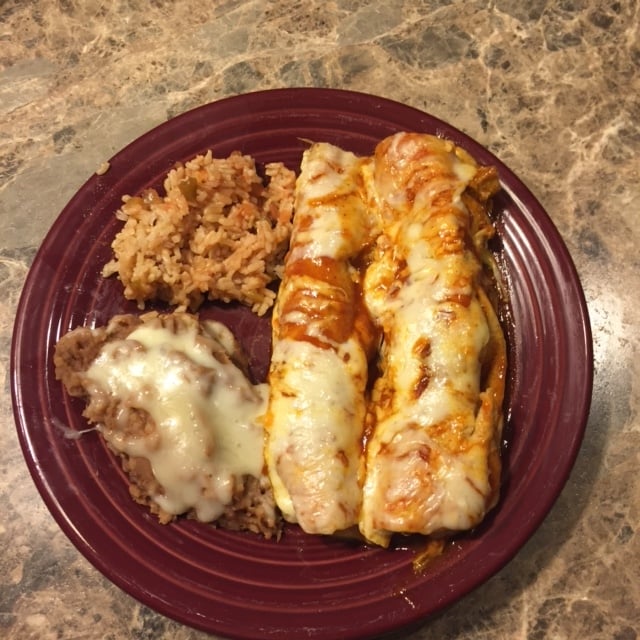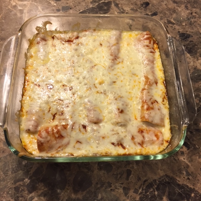 5) rolled meat in tortillas, placed in pan. Covered in sauce and Monterrey Jack cheese