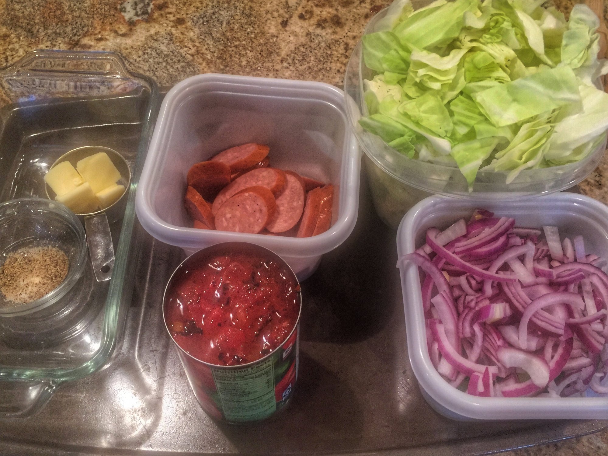 For the line up we have kielbasa, red onion, green pepper, diced tomatoes and cabbage
