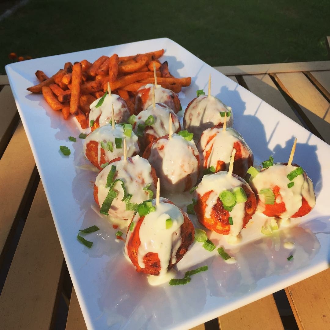 Buffalo Chicken Meatballs with Blue Cheese Sauce