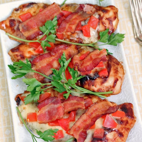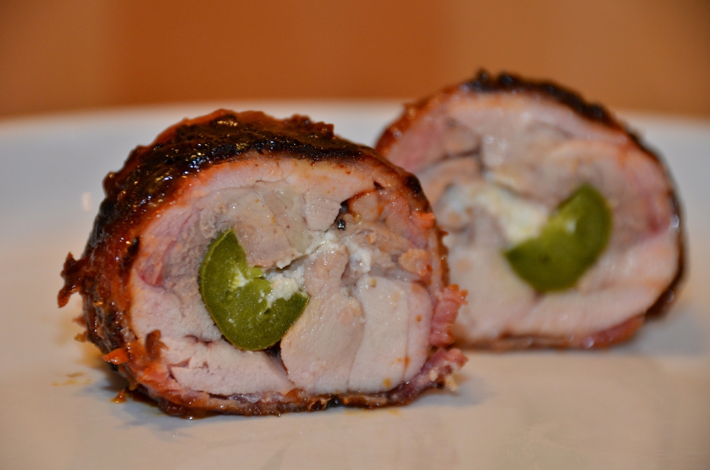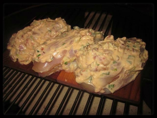 Monteray Jack stuffed Chicken Breasts on a plank with a chipotle, bacon and mayo slather.