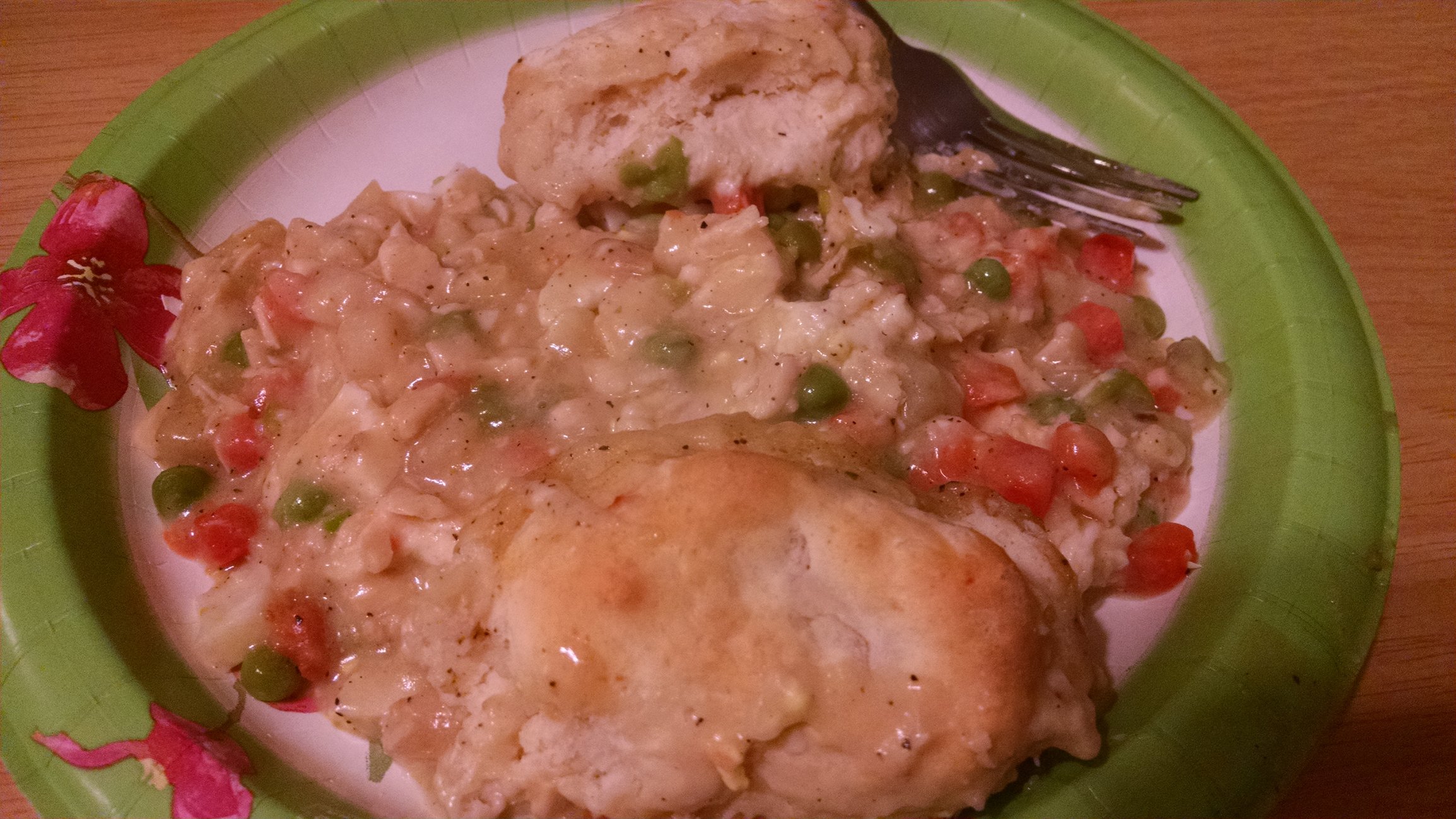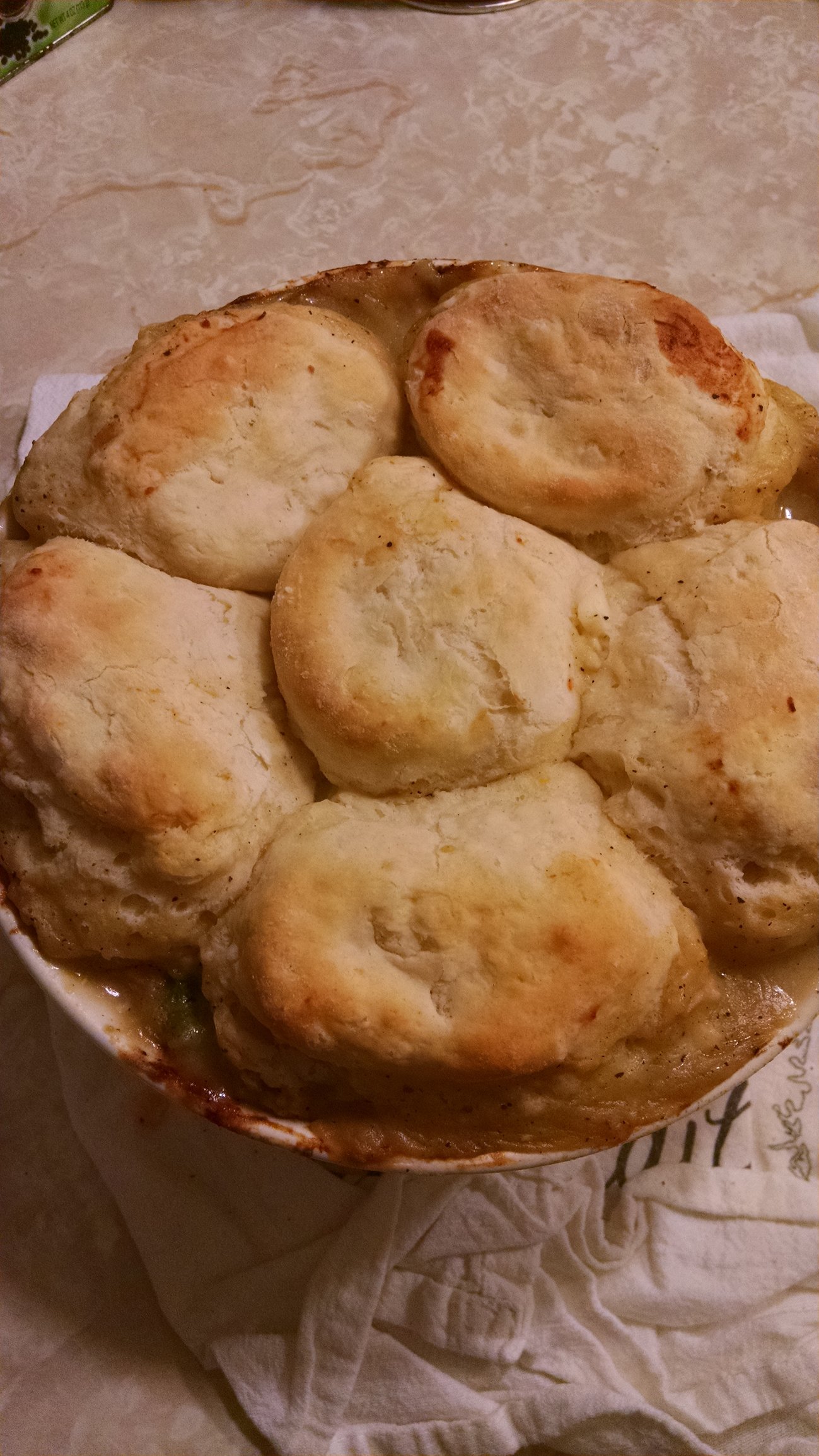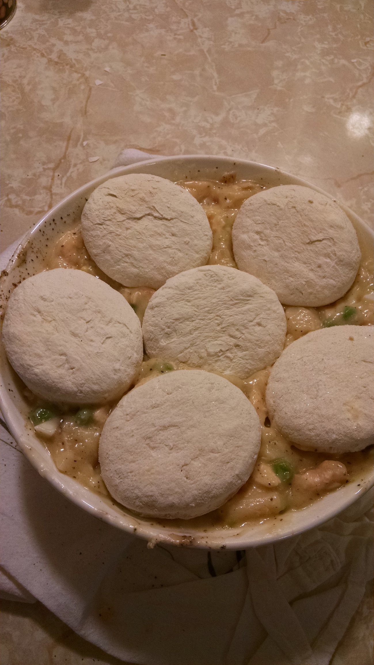Left over chicken, so played around with chicken pot pie, topped with Mary b's biscuits. Turned out yum yum.