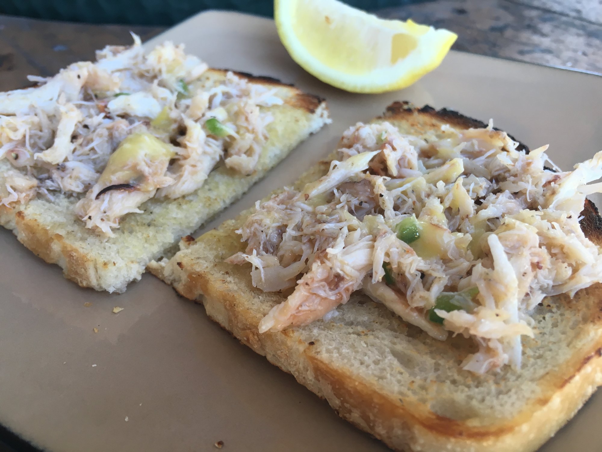 The base was sliced sourdough brushed with olive oil and toasted (grilled), then topped with crab mixture and drizzled with the aioli, and a few thin slices of Pecorino.