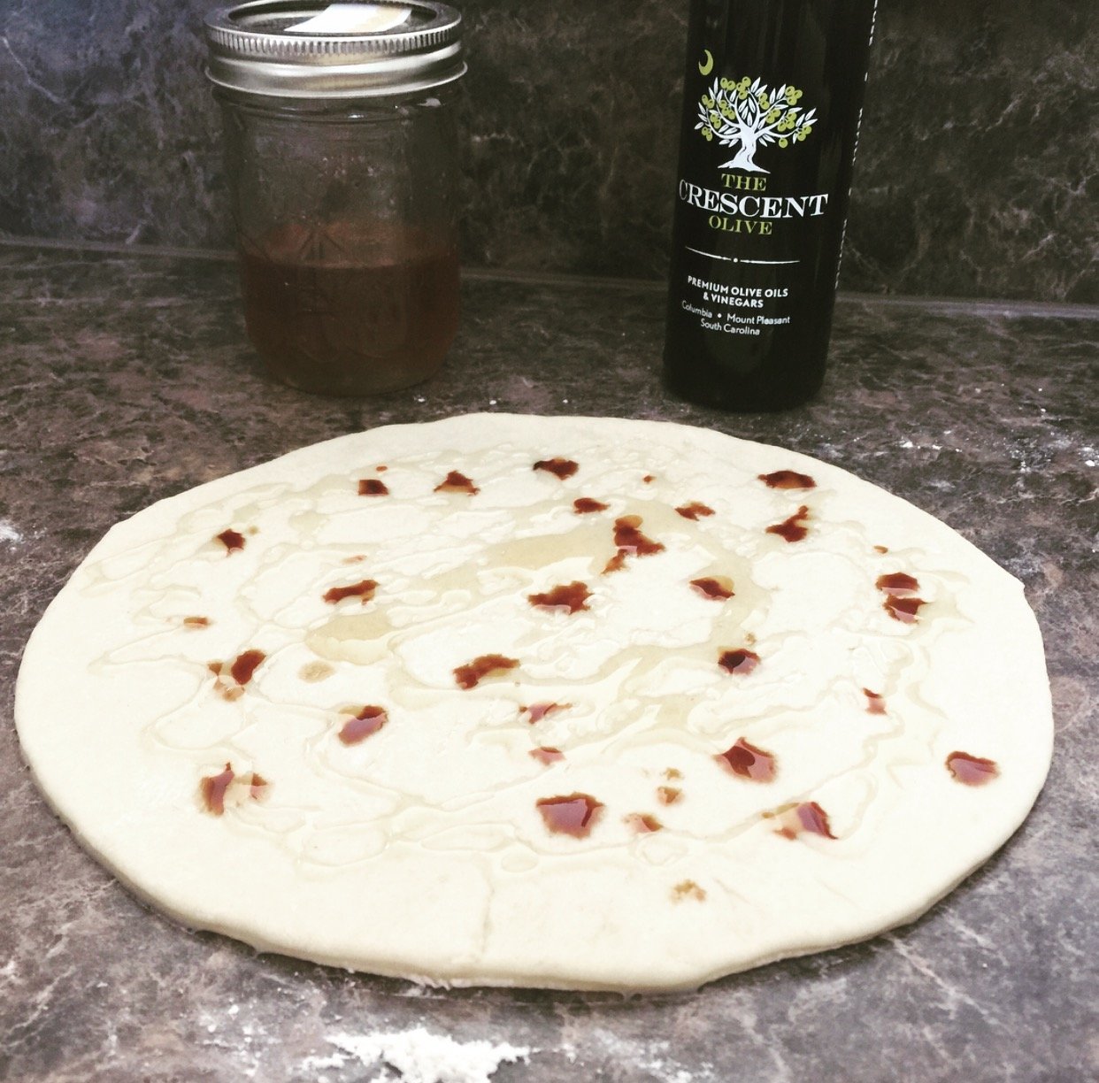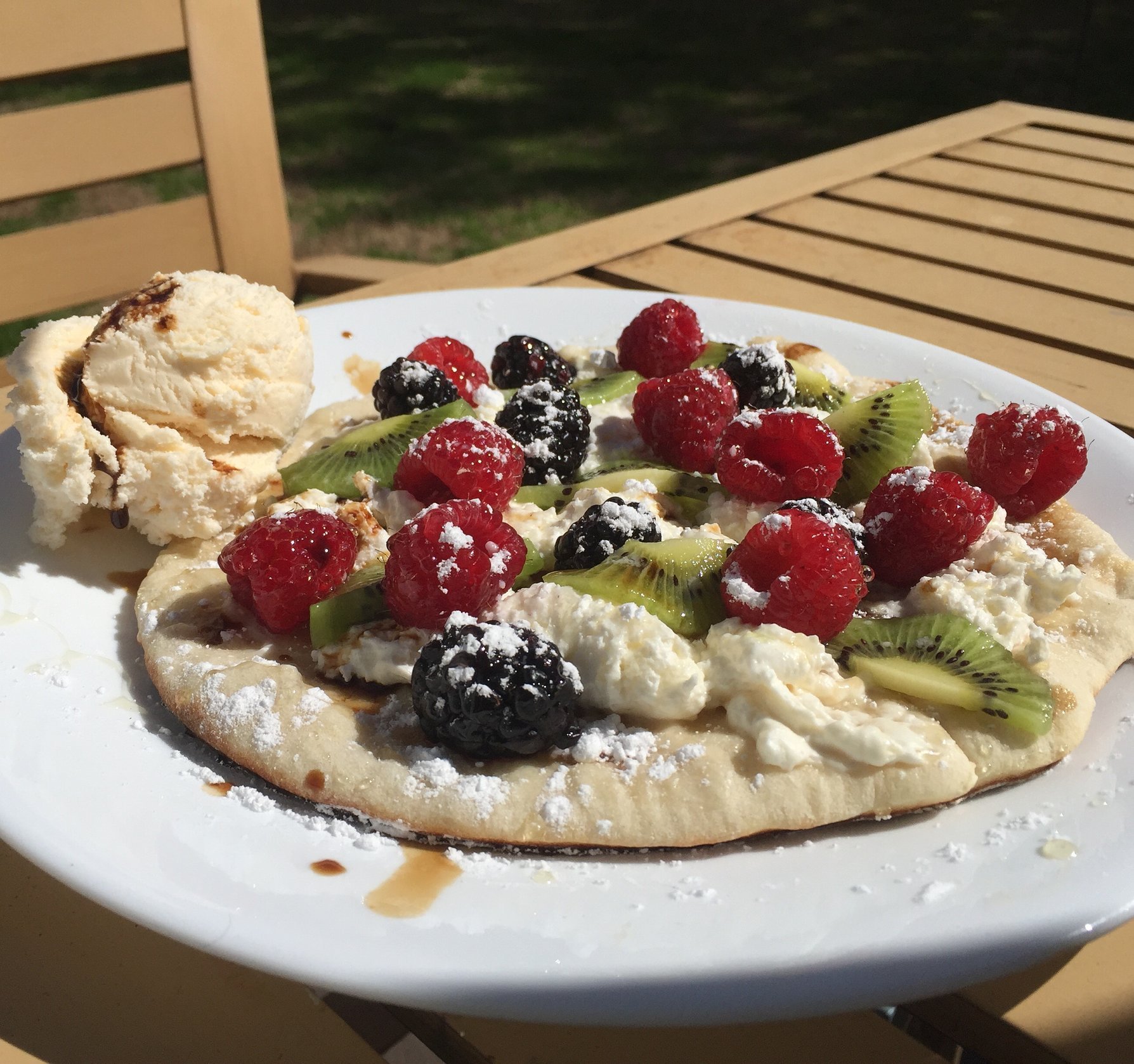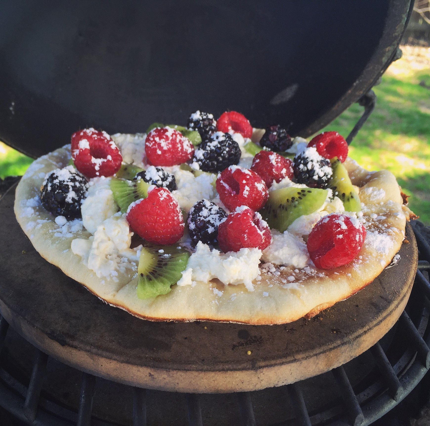 Made a little Sunday afternoon dessert and spending time in this awesome weather. Personal sized dessert pizza on the Mini, drizzled with honey and expresso dark balsamic. Added some whipped cream cheese, kiwis, blackberries, raspberries and powdered sugar at the end.