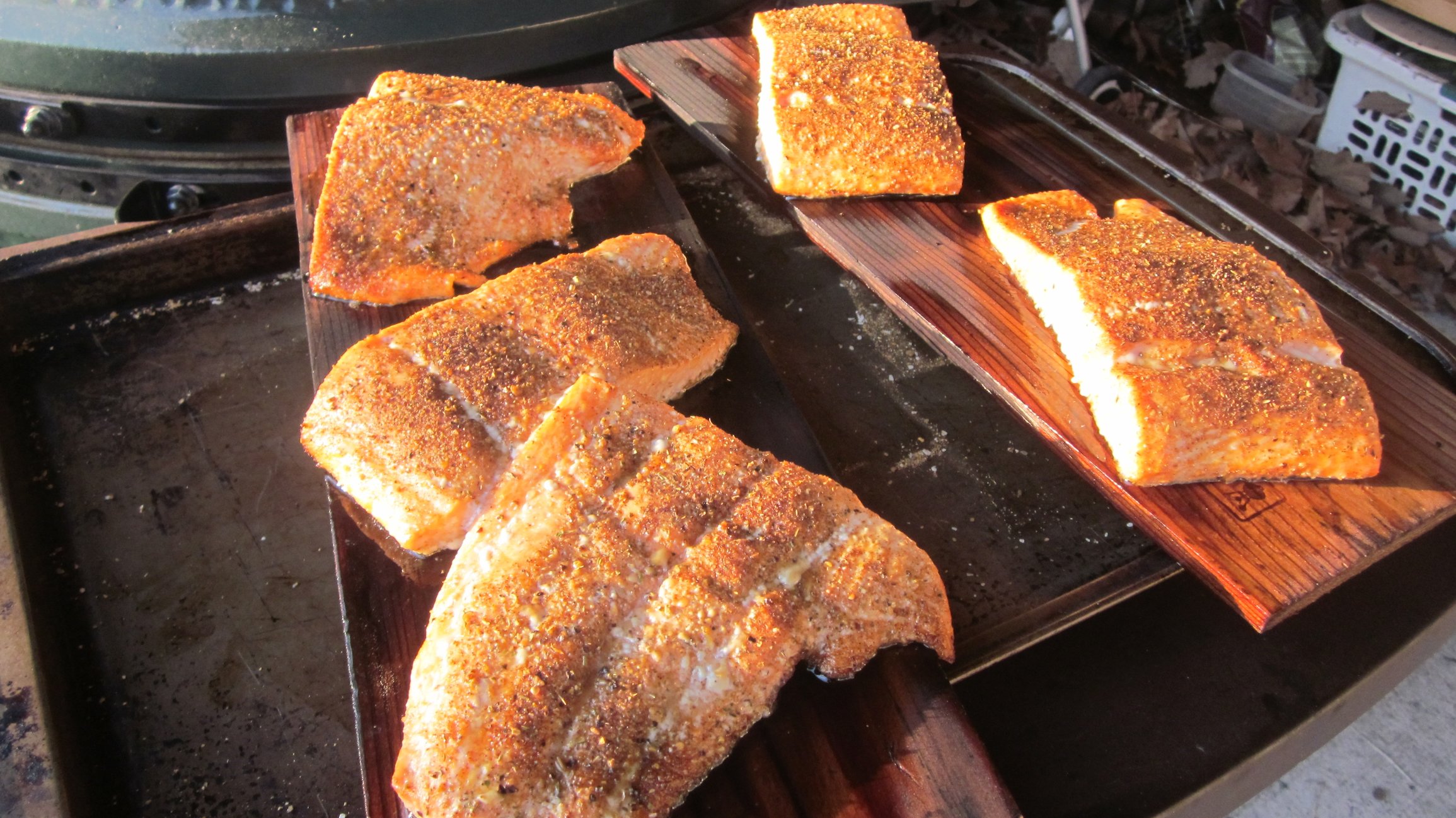 Rubbed with DP Raging River and cooked 425 raised direct for 12 minutes. I wish I can bottle the smell of the cedar smoke.....it's intoxicating.