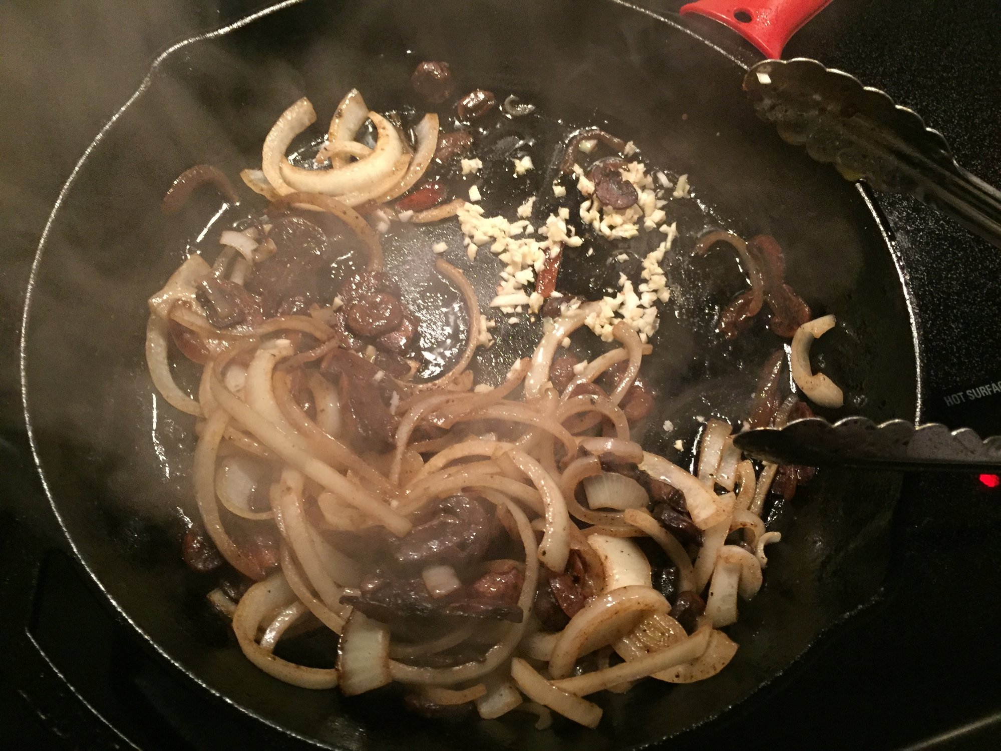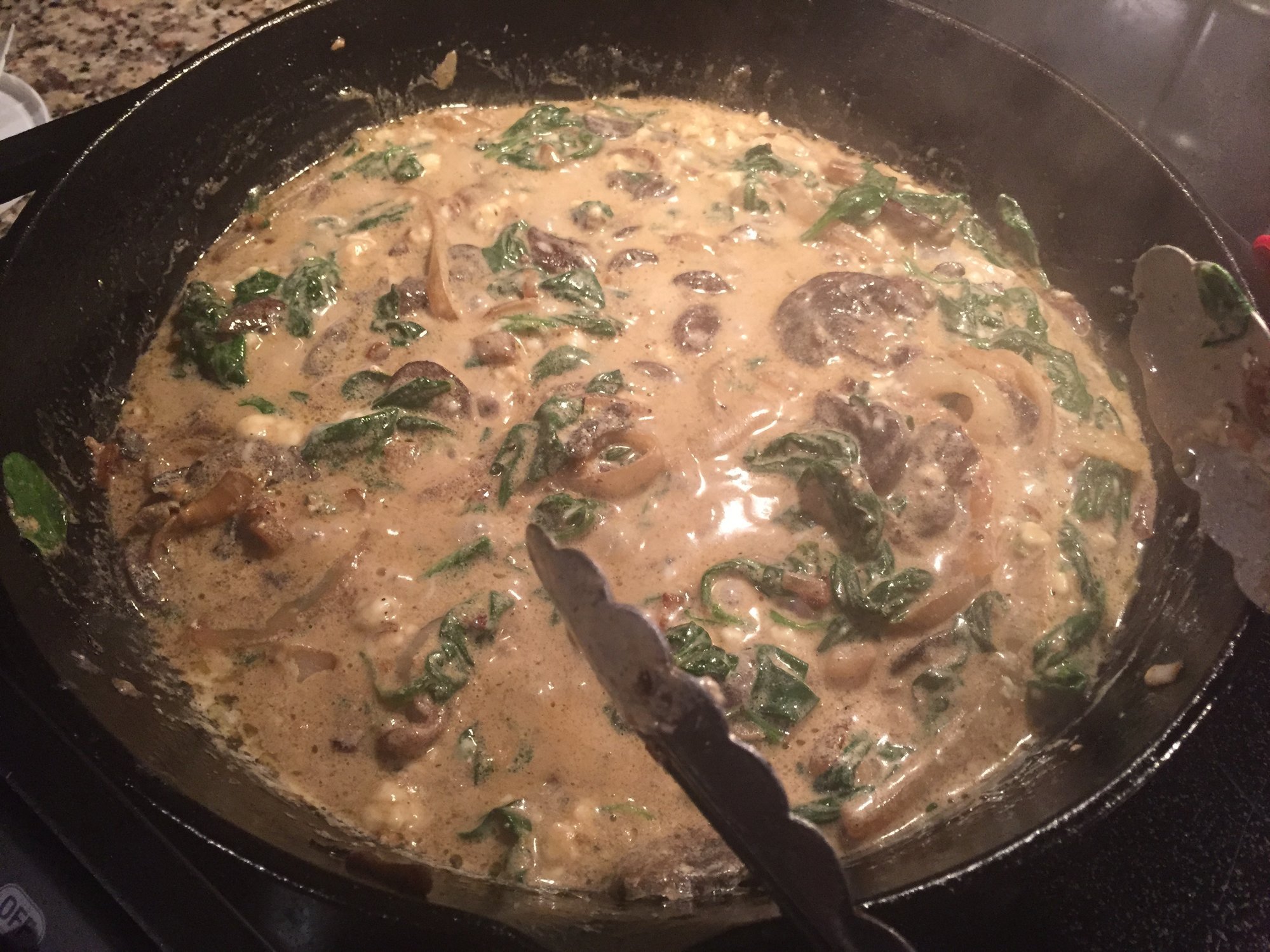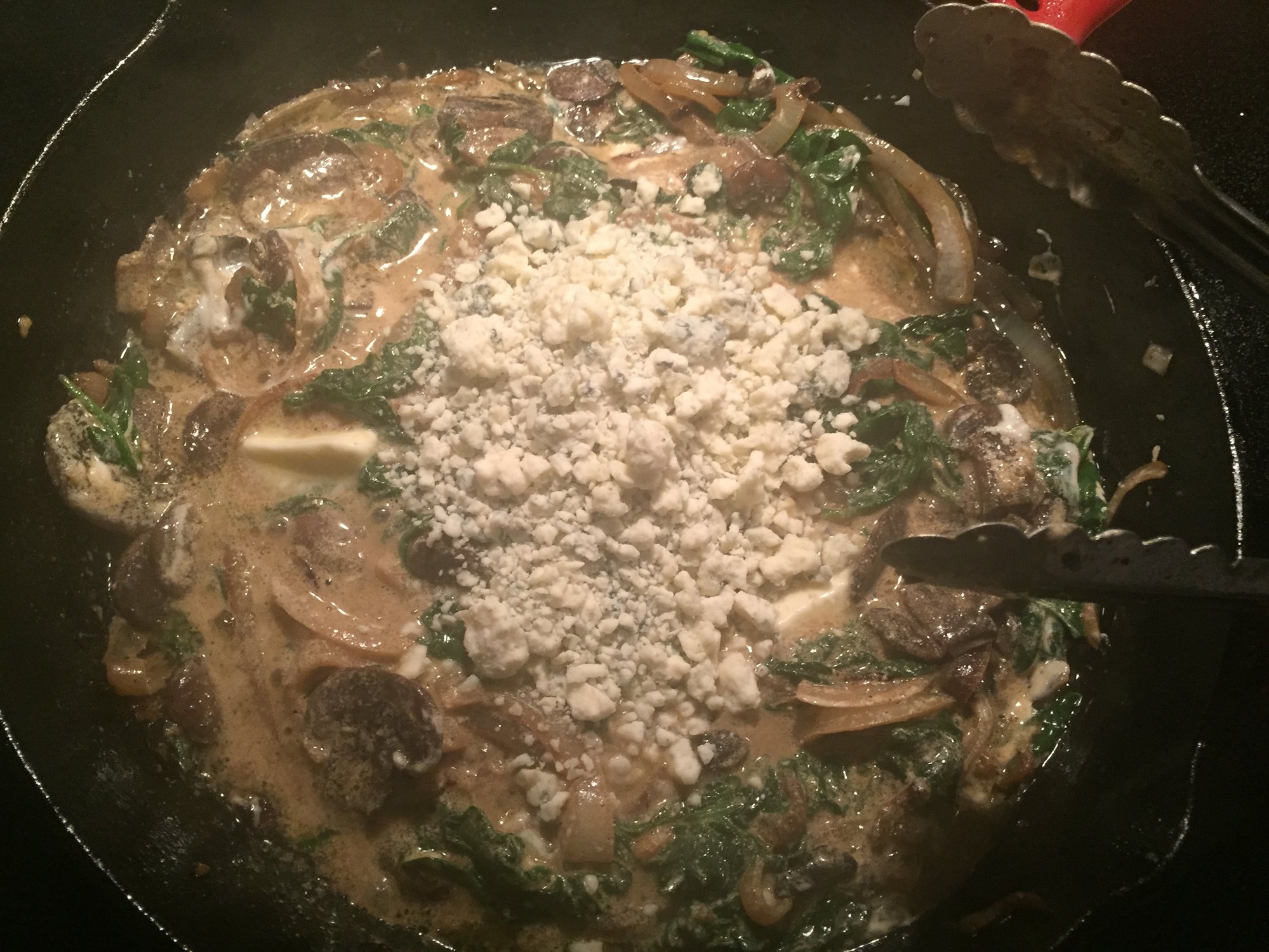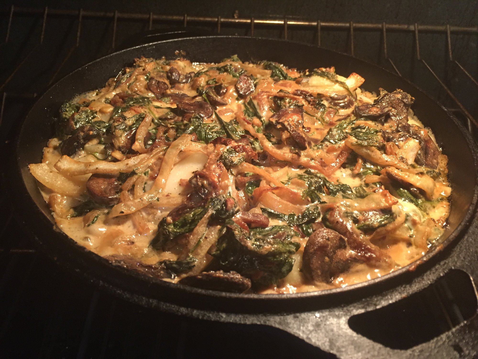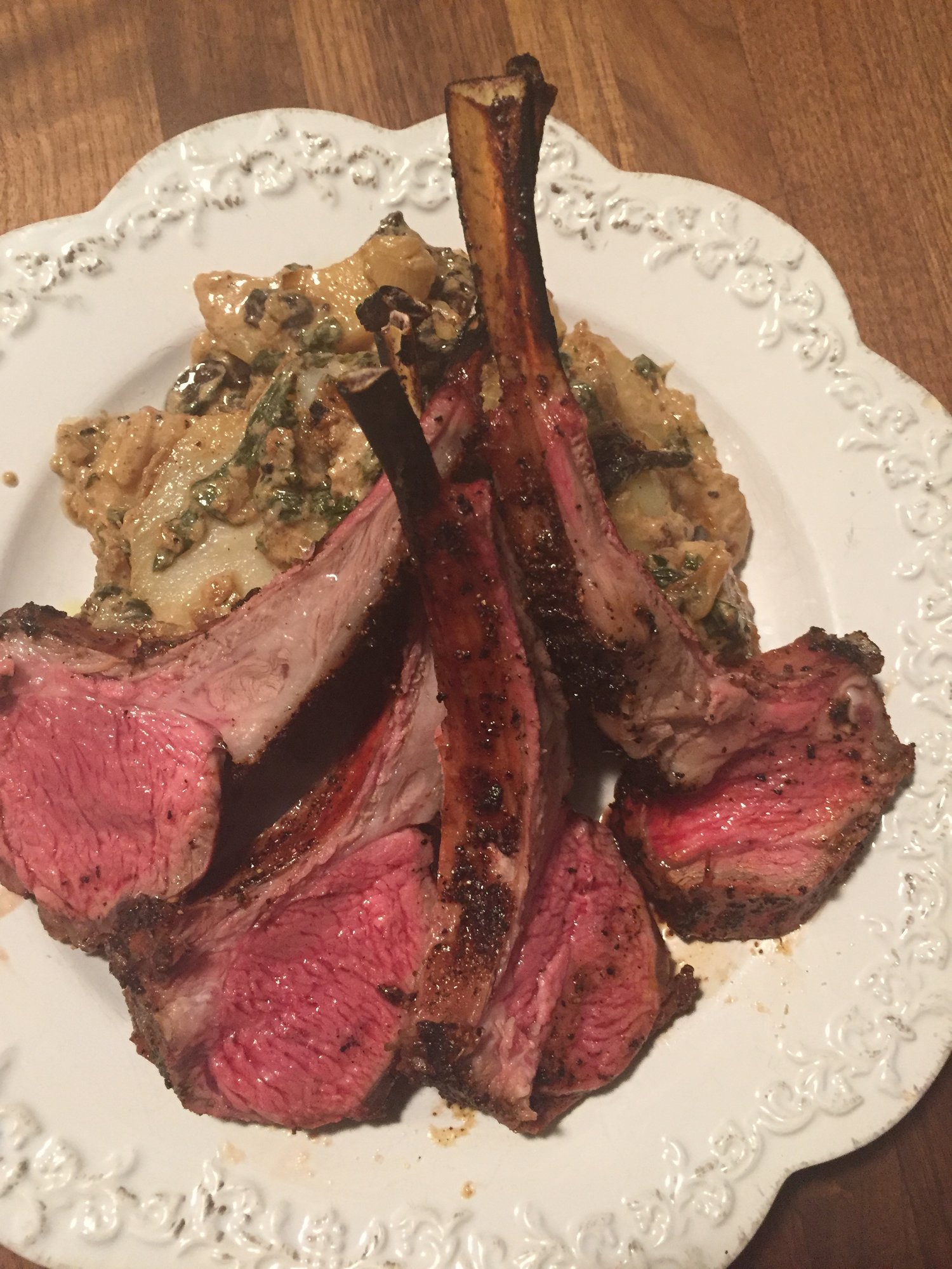 marinated lamb in a mixture of evoo, dijon mustard and lemon juice, the seasoned with salt and @MeatChurch Holy Cow, direct at 450 for 3 minutes a side then indirect at 400 until close to 125-130 IT. potatoes were par boiled for 7 minutes then sliced and layered in a CI skillet. sauce was garlic, evoo, mushrooms, spinach, half and half, gorgonzola all married together then poured over the potatoes and into the over at 400 until done.