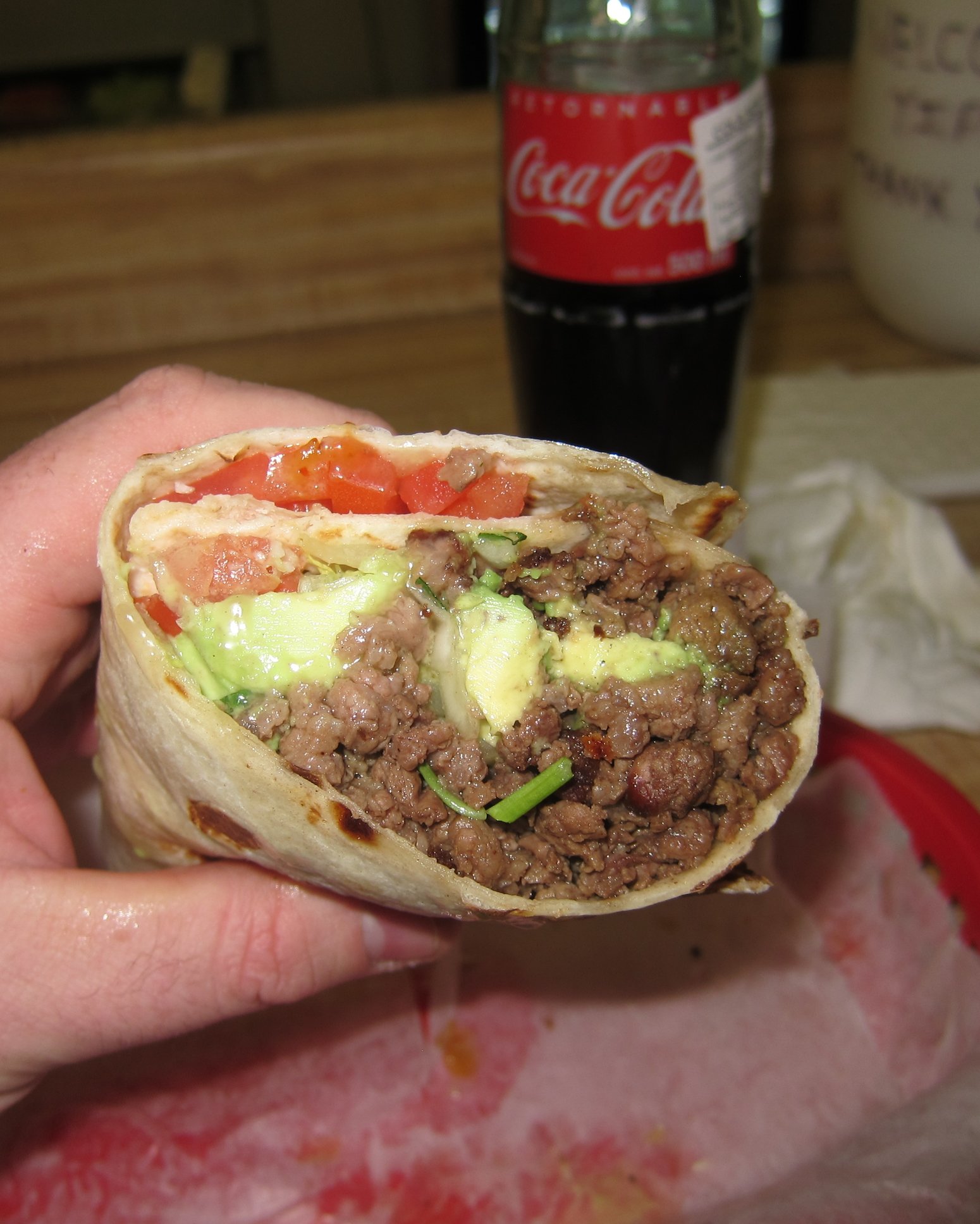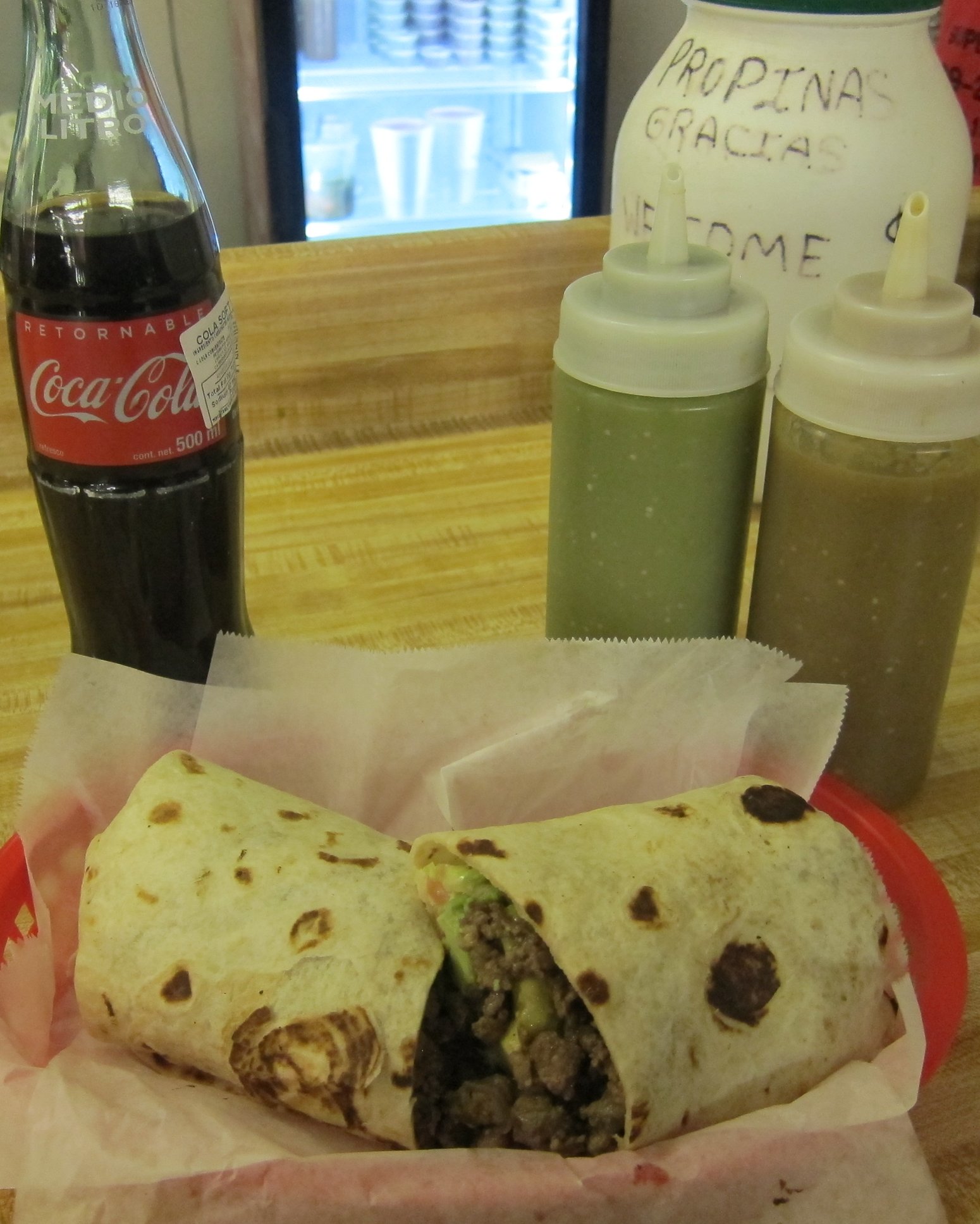 Azada burrito, no beans, avocado....and 500mLs of Mexican Coke. $15 for two, can't be beat.