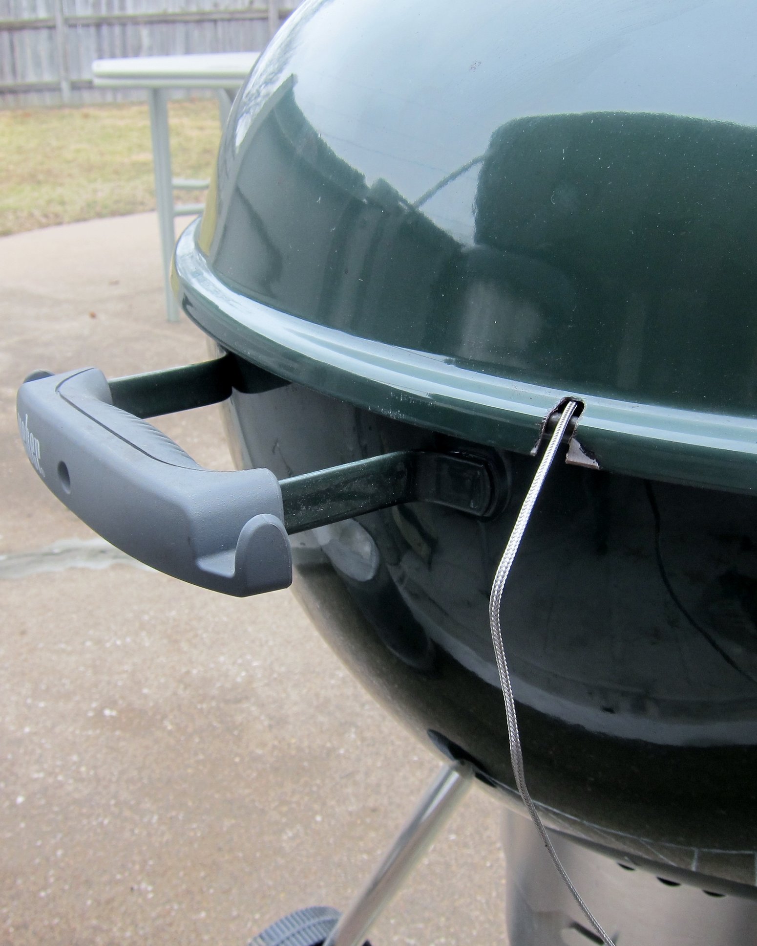 While adding the slab I set the lid on a chair. A little wind, and the lid bounced off the concrete patio, only damage was a nice sized chip on the lip. My entire older Weber OTG rolled out of my truck on the I-74 bridge with no damage. Seems like the newer kettles aren't made as well, and with a thinner gauge.
