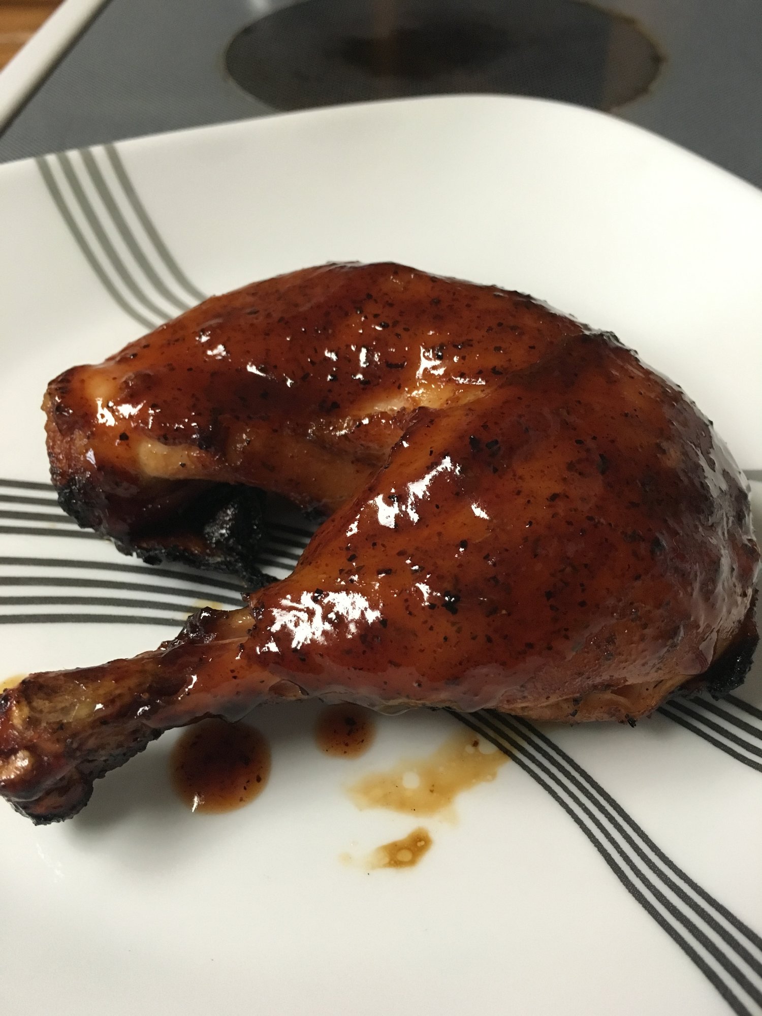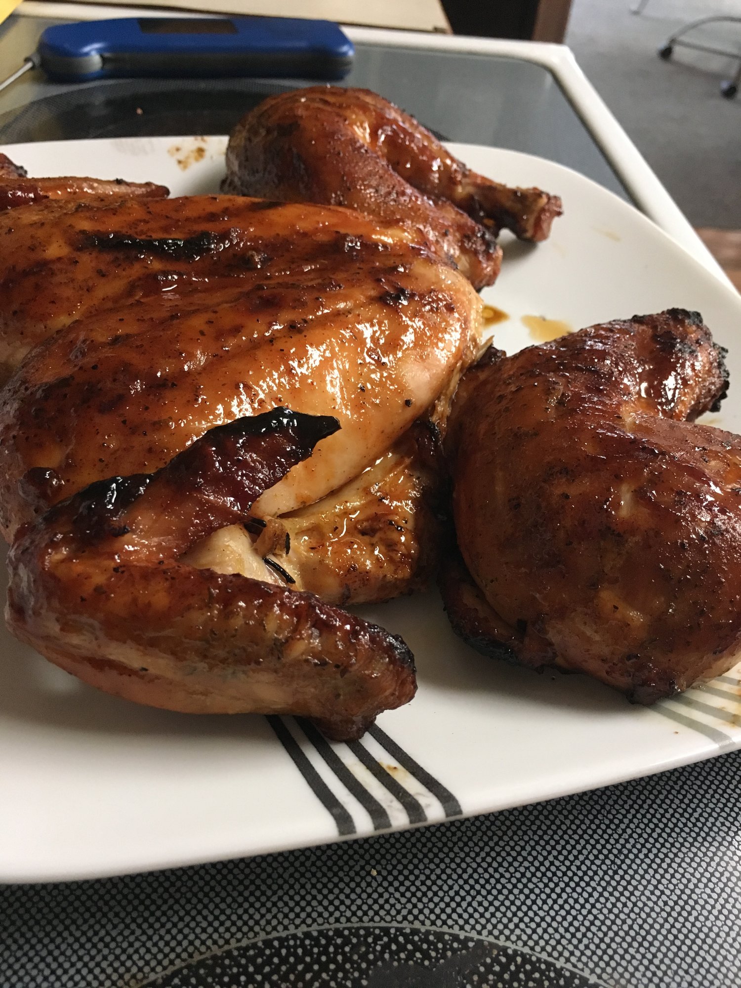 so for lunch I cooked up this beaut. No skin. Went 400 raised direct with BGE pecan rub and cherry wood. Topped with pellet envy IPO sauce.