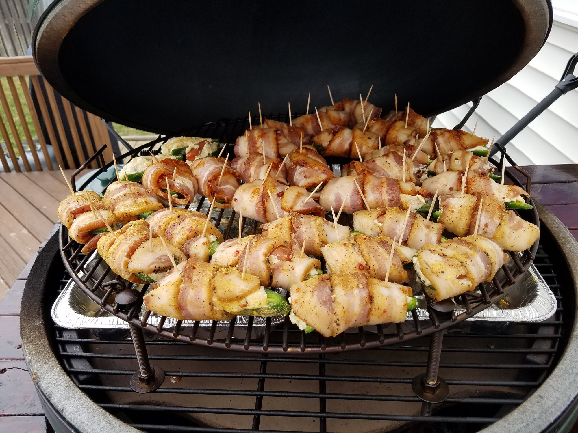 Thick Cut Chipotle Bacon and Garlic Bacon were used to wrap, with a mix of cream cheese, pepper jack, s&p, cayenne, and paprika.
