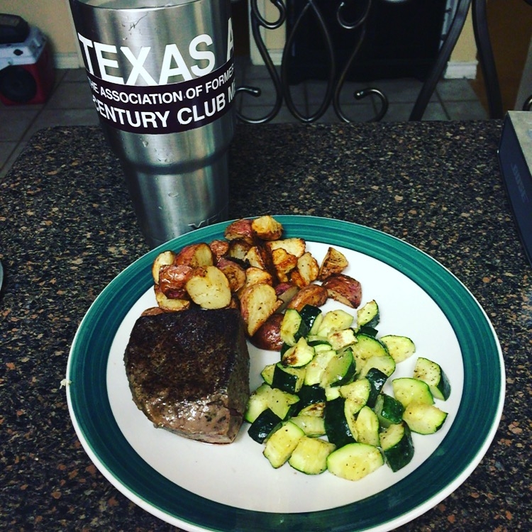 I'm not sure what could go better with basketball  but an 8ish ounce prime filet, skillet potatoes and zucchini. Sous vide makes feel like I can't screw up a steak. About an hour and a half at 132 and then 60 seconds a side with a top off of butter. Absolutely delicious and my favorite meal. Now let's go Ags