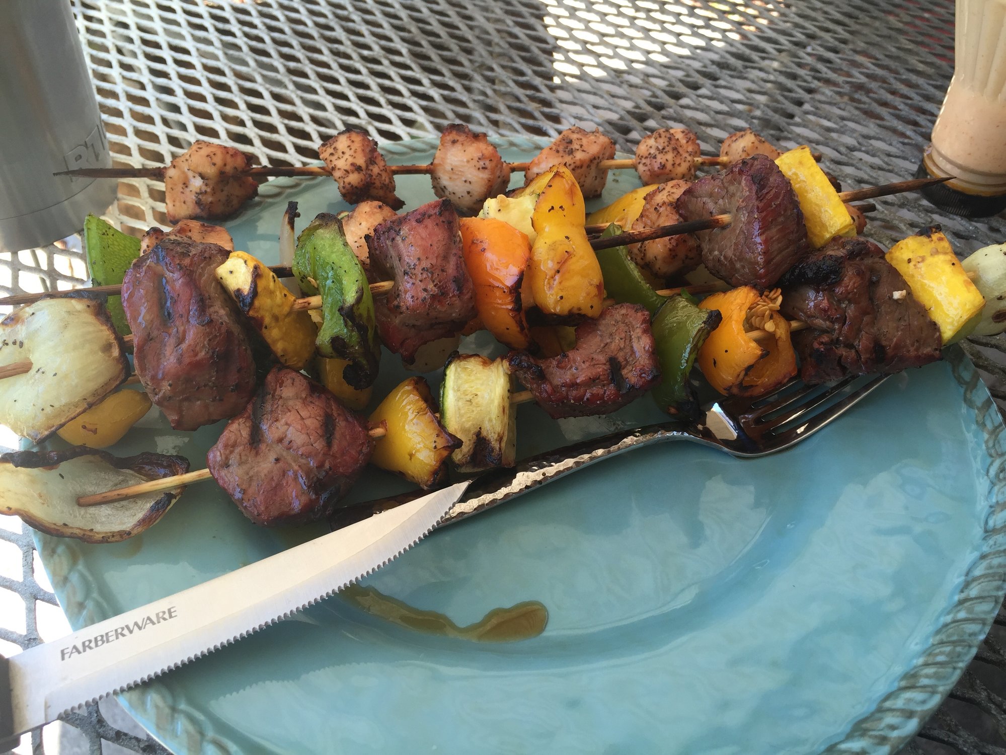 made some kabobs for lunch. A couple chicken. And some steak, with green, yellow, orange bell pepper. And squash, zuchini and onion.