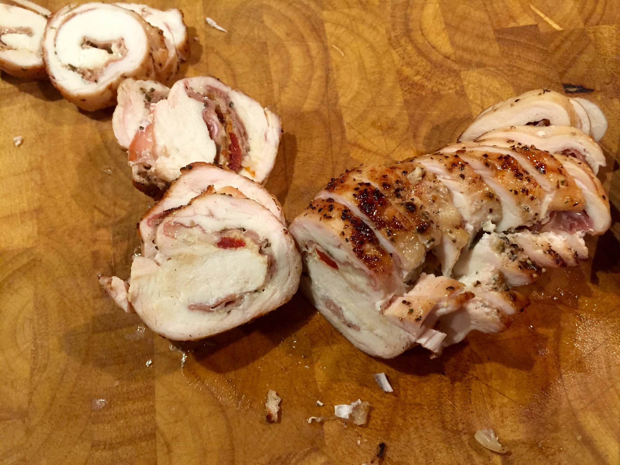 butterflied and pounded, rolled tight with prosciutto, marinated red peppers, sun dried tomatoes and provolone, tough to twist the ends
