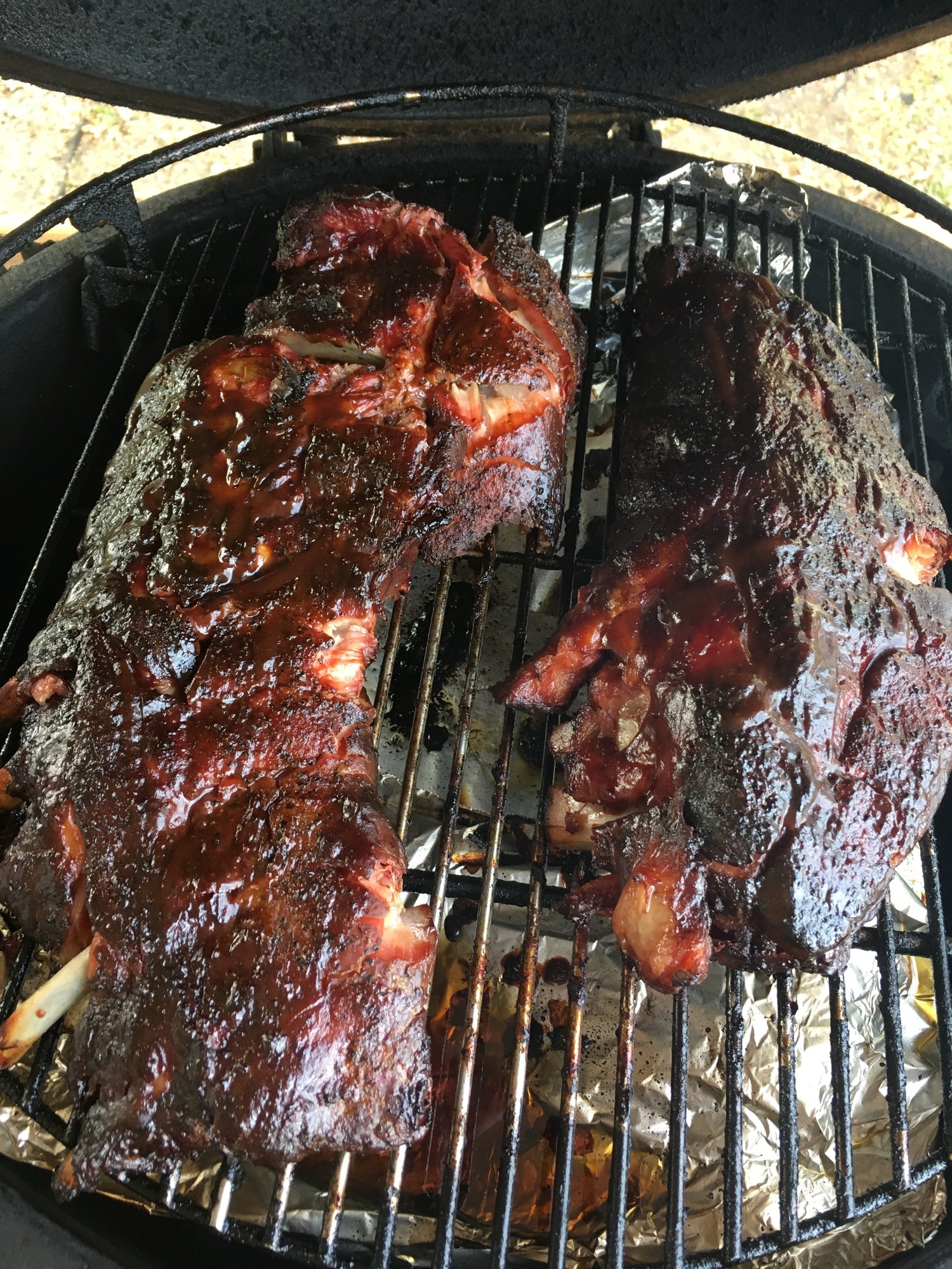 Coomed up two slabs of baby back ribs this afternoon. Cooked 3.5/1.5/.5 at 275 dome with a mix of oak and pecan. Rub was salt, pepper, onion powder, garlic powder, paprika.