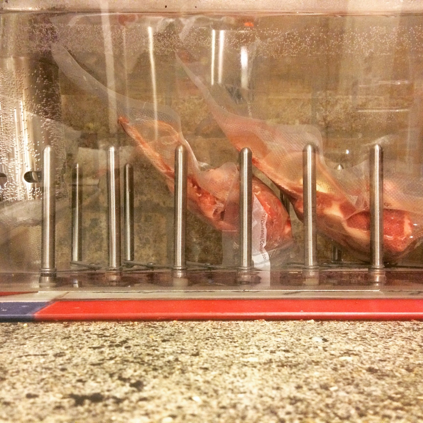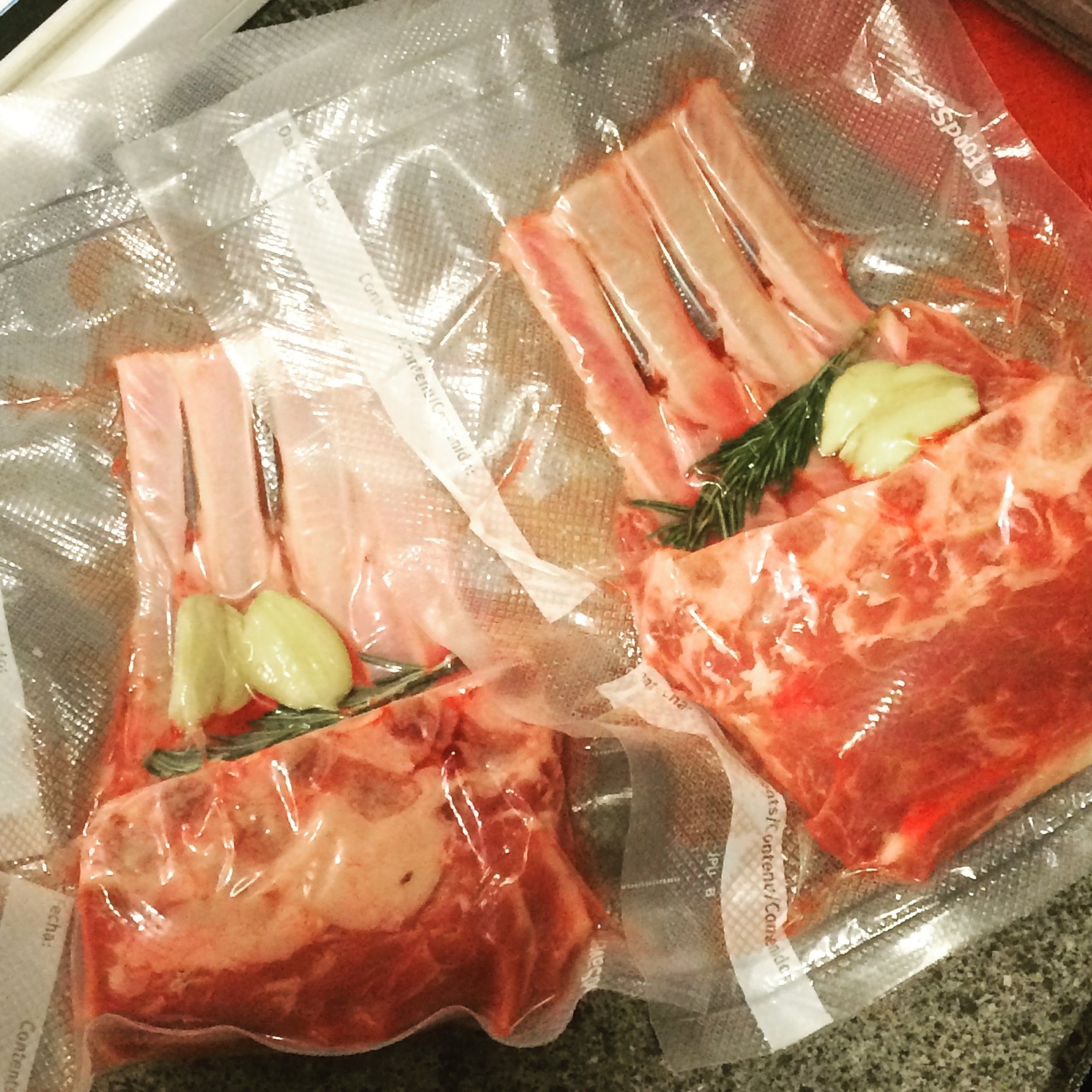 The lamb was sous vide for about 11-16 hours @130.5F with a sprig of rosemary and a crushed clove of garlic, then seasoned with pepper and garlic before being seared on the egg.