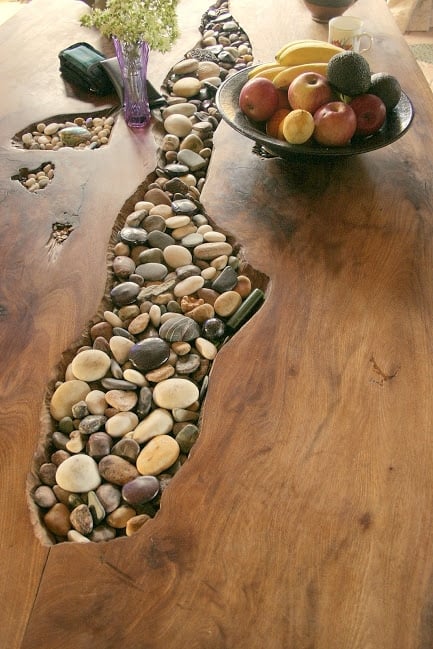 I have no interest in an egg table, but I do need a side table next to the egg. I saw this one a while ago and one of these days, I'd love to build something with a top like this. Obviously, I could cut the rock openings as large as I need for as many hot things as I think I might have, a DO for instance. I just thought it was a cool table top, hot things or not.