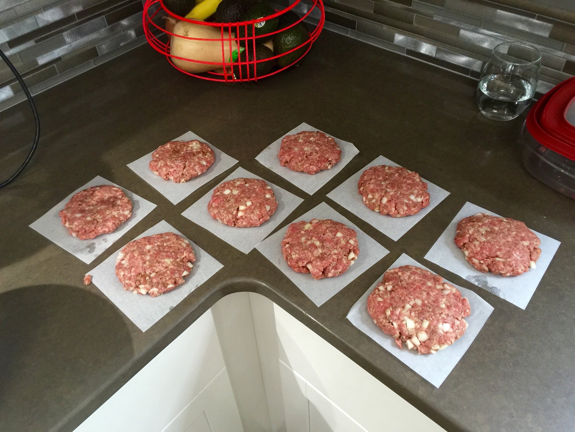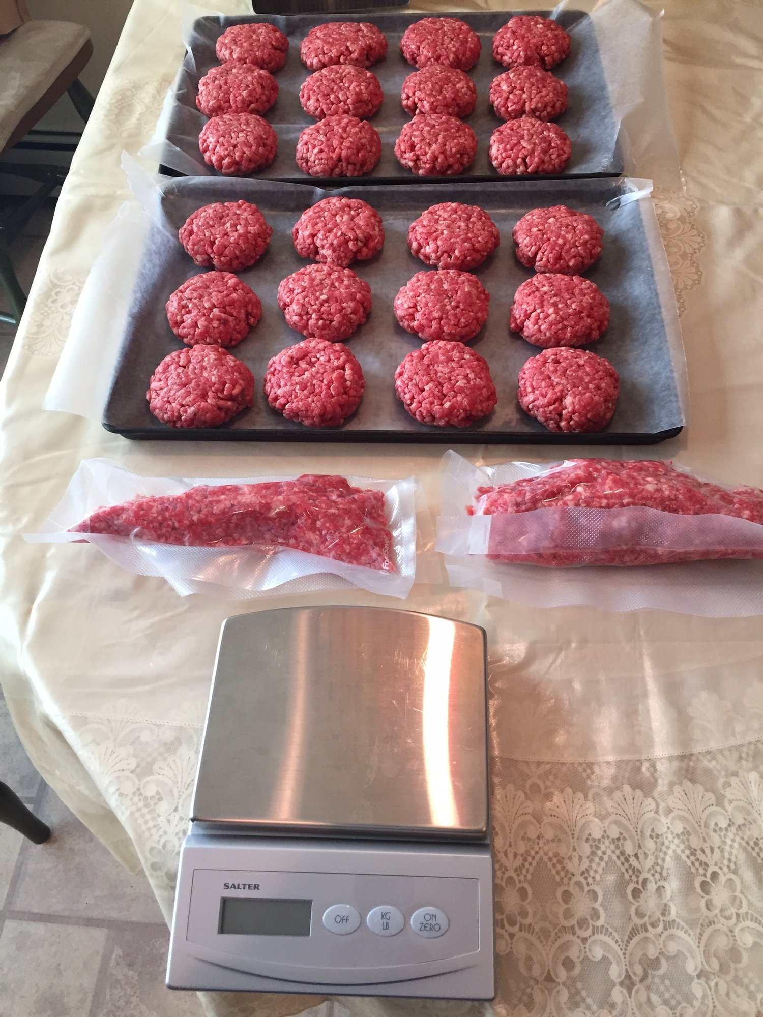The meat all portioned out and made into burgers with a couple of 1lb. bundles for tacos. Most were vacuumed sealed for later eats but I did cook some for dinner.