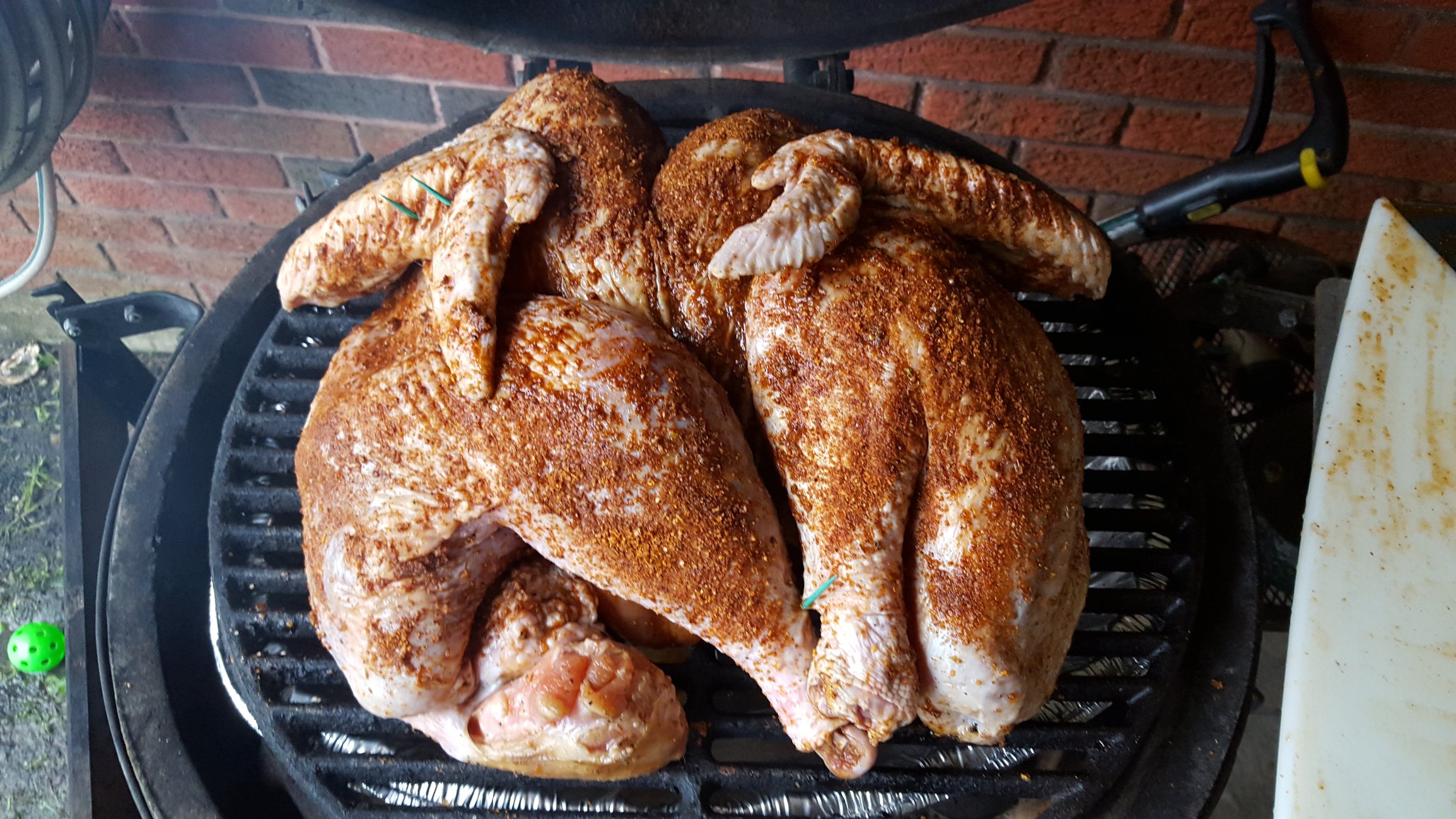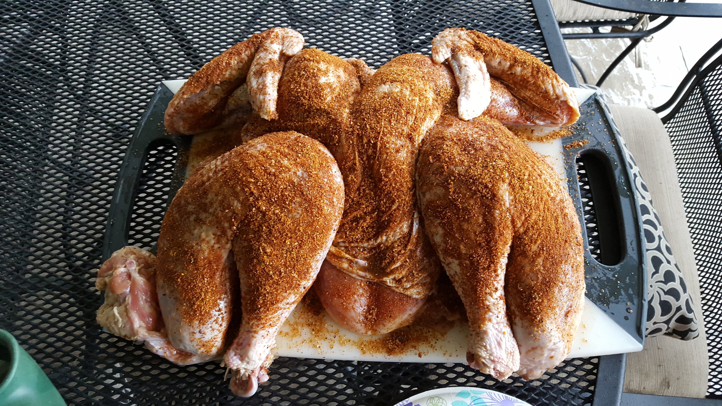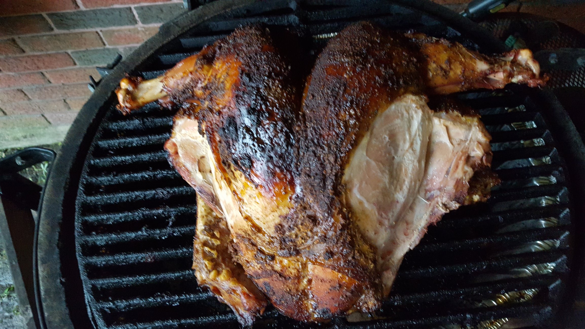 I'm not a big skin guy, I've pretty much devoured all the skin. This was a 15lb bird from Whole Foods. The rub was a mixture of DP Pineapple Head and Swamp Venom because I didn't have enough of either one to cover the top and bottom of the bird. The legs and thighs came to temp before breast, I had to cut them so they wouldn't over cook. It was done just south of 3 hours.