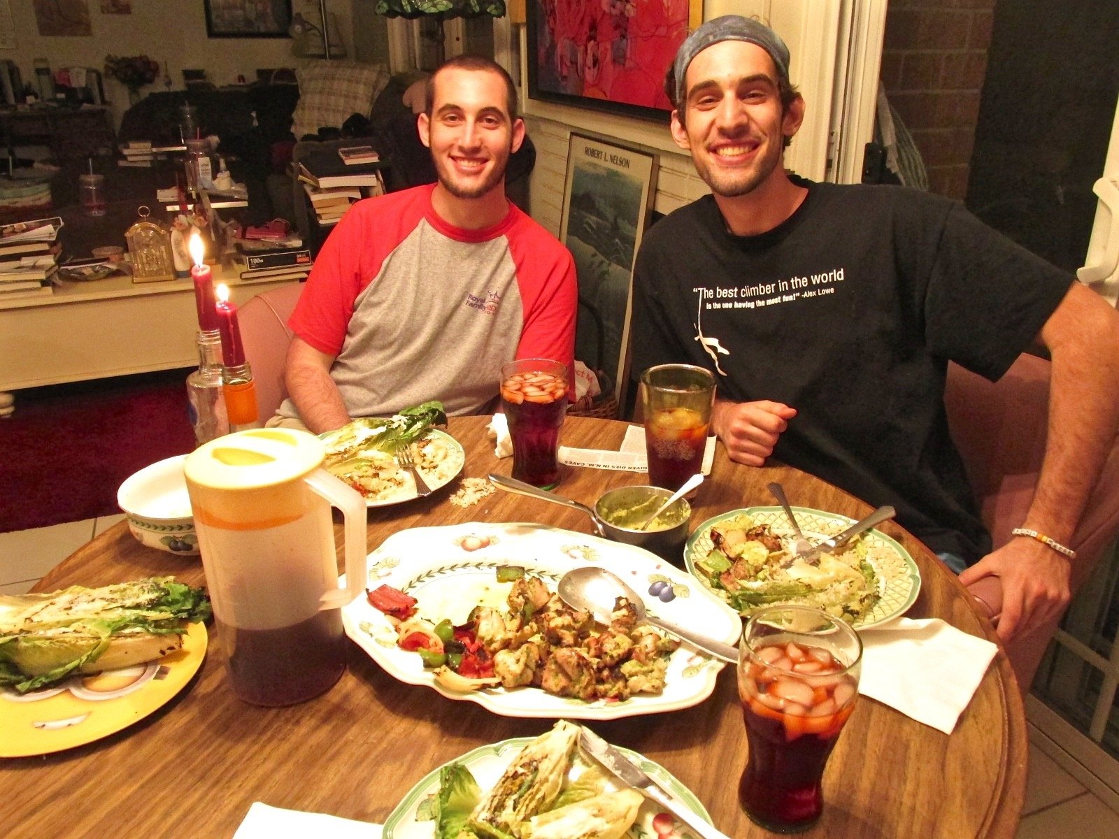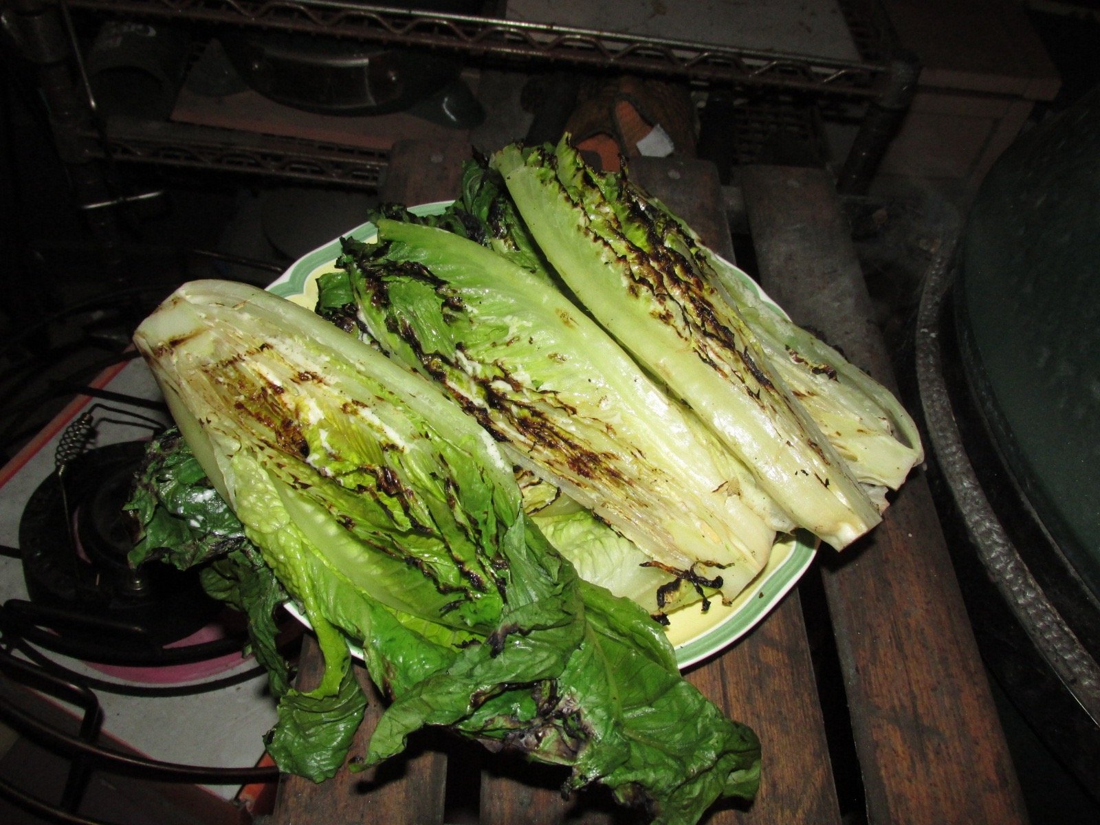 Caesar dressing on the grilled romaine, brown basmati rice, and tomatoes, onions, and red and green bell peppers on skewers.