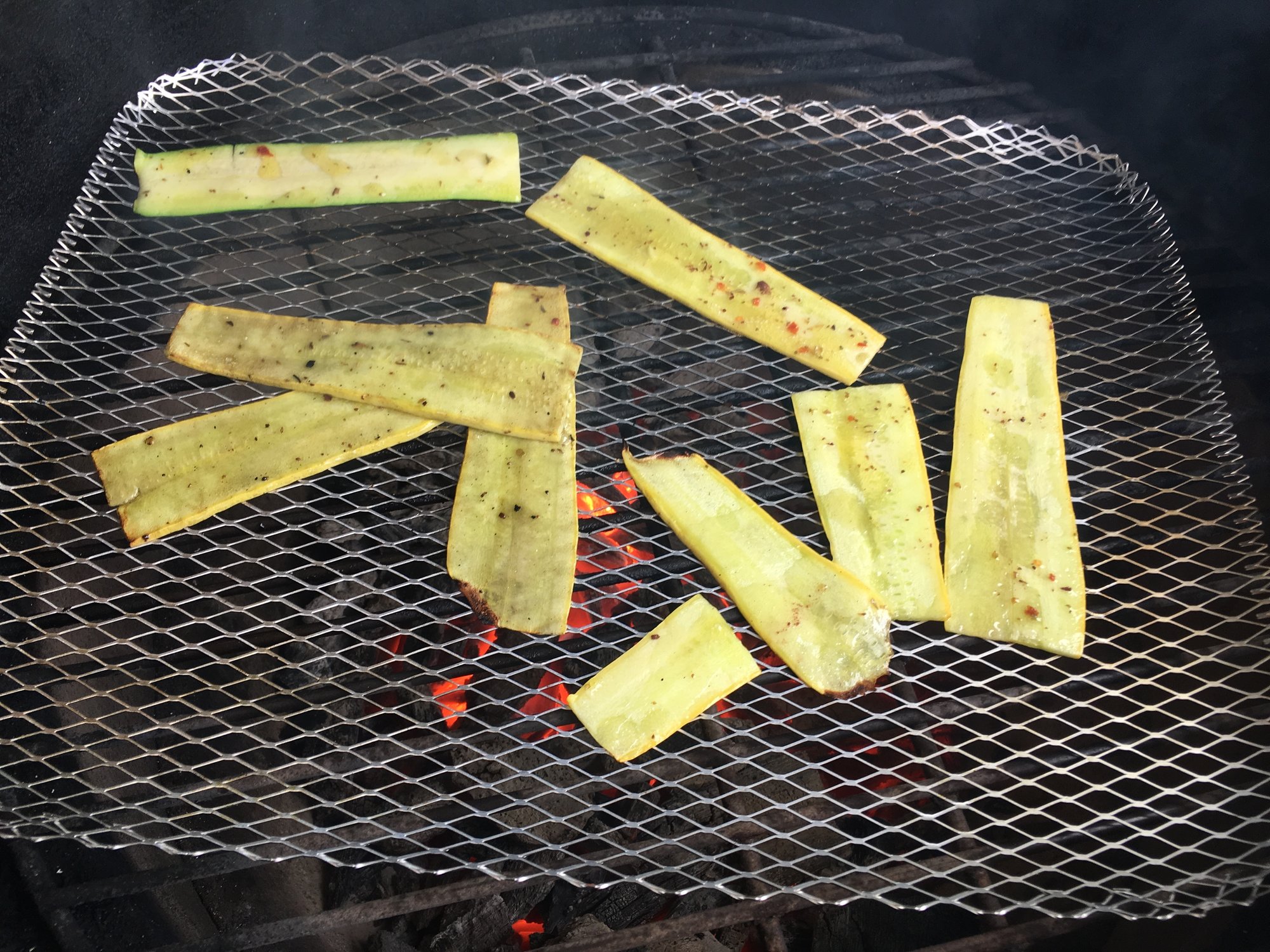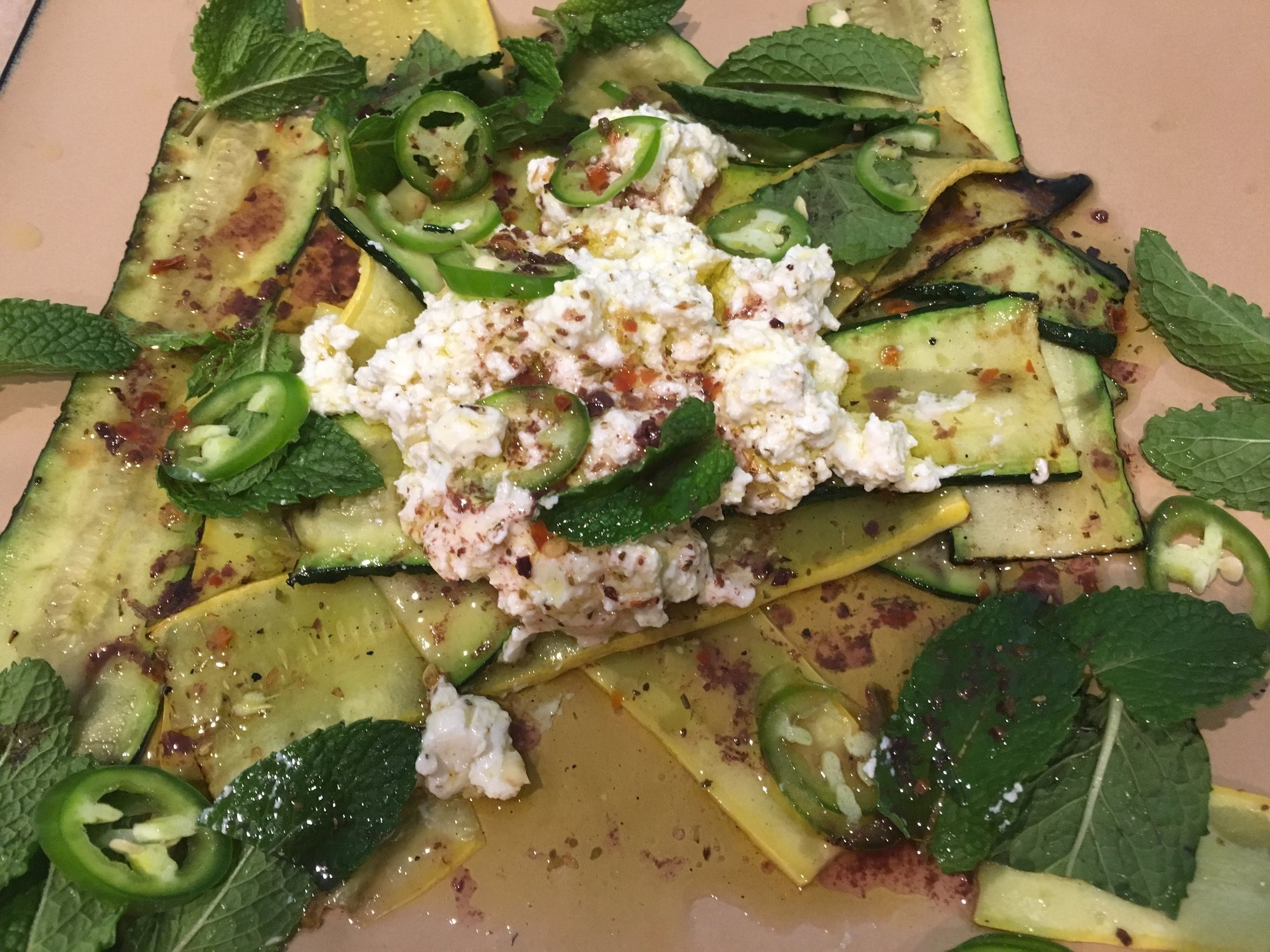 The zucchini were sliced razor thin, dipped in a red wine, olive oil, and black olive paste marinade, and quickly grilled. Served with ricotta cheese and olive oil mixture, with fresh mint and paper thin Serrano pepper slices. Drizzled the marinade over the top. Very good.