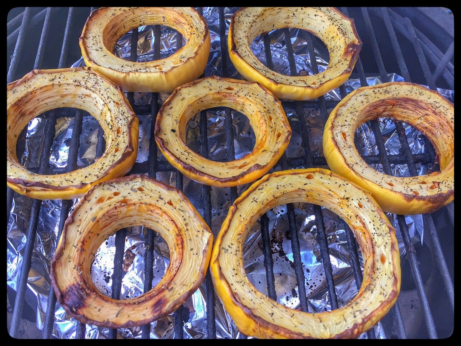 2 spaghetti squash sliced and rubbed with salt and Italian herbs just put on the large at 350° indirect