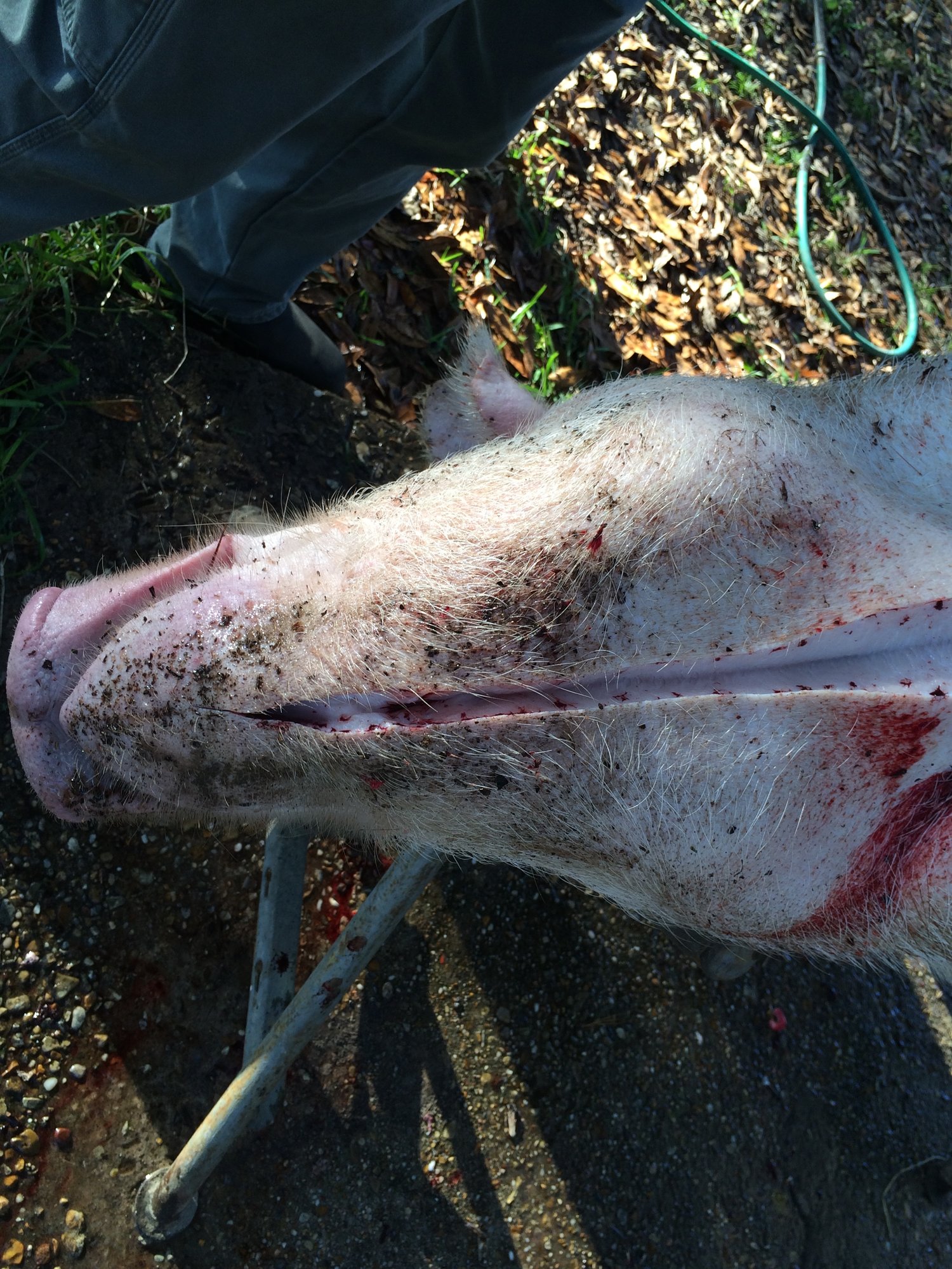 Above you can see how to make the first cut to seperate them into two whole pieces. The cut should run from under the base of the snout all the way to the wind pipe.Location- Just "this side" of Biloxi, Ms.