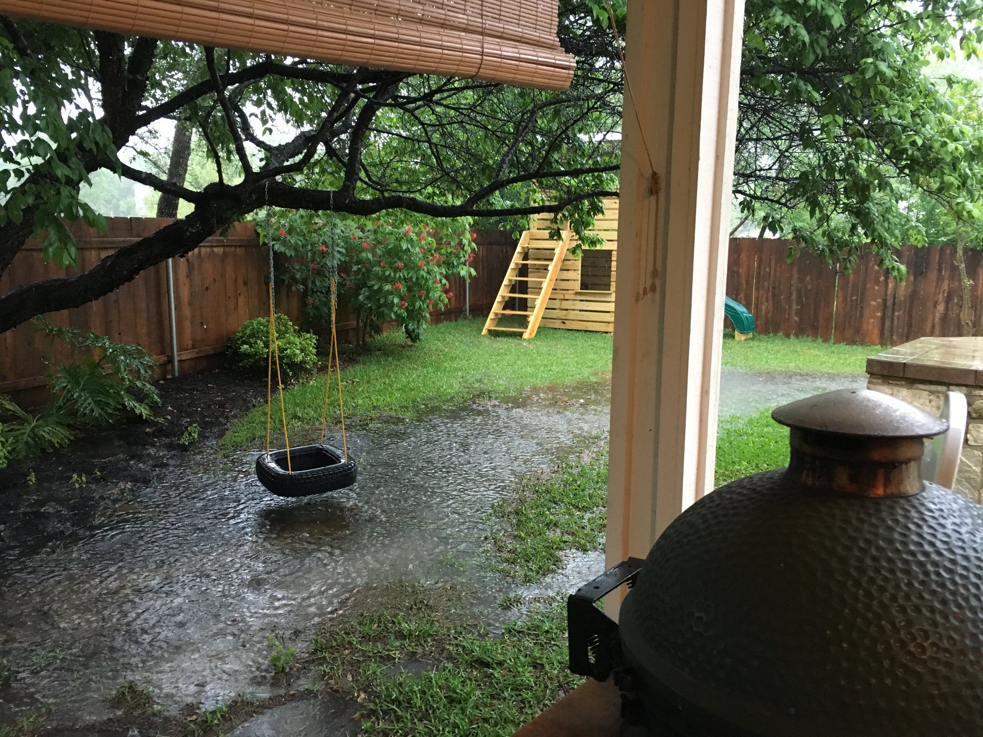 We are getting torrential rain here...a good 2" between the time I lit the Egg and when I finished cooking. You can see how much water is pooling in the yard. But my cooking area is covered, so did a shrimp on the Barbie. Turned out well, and went well with the rice. Side salad (not pictured).