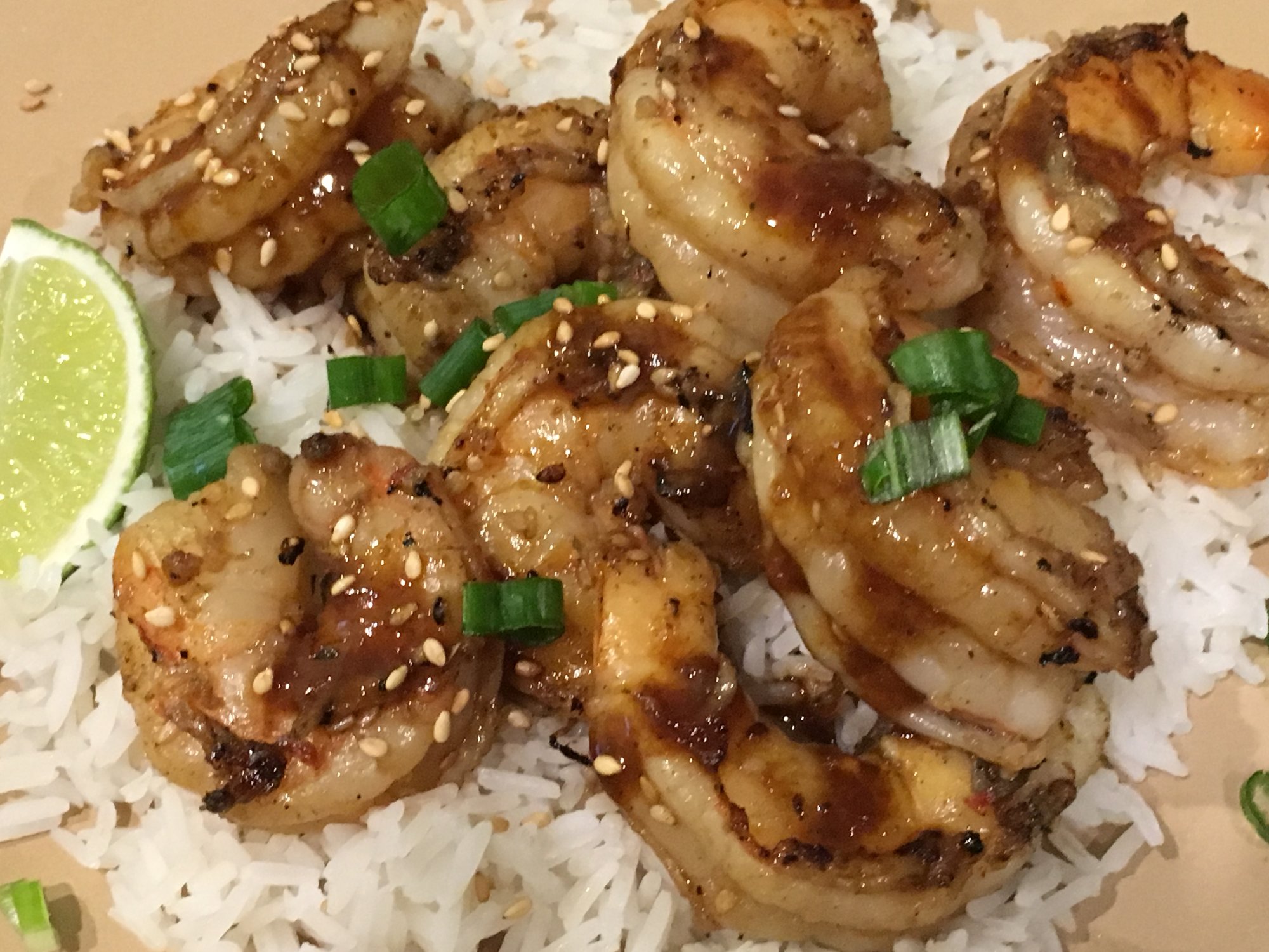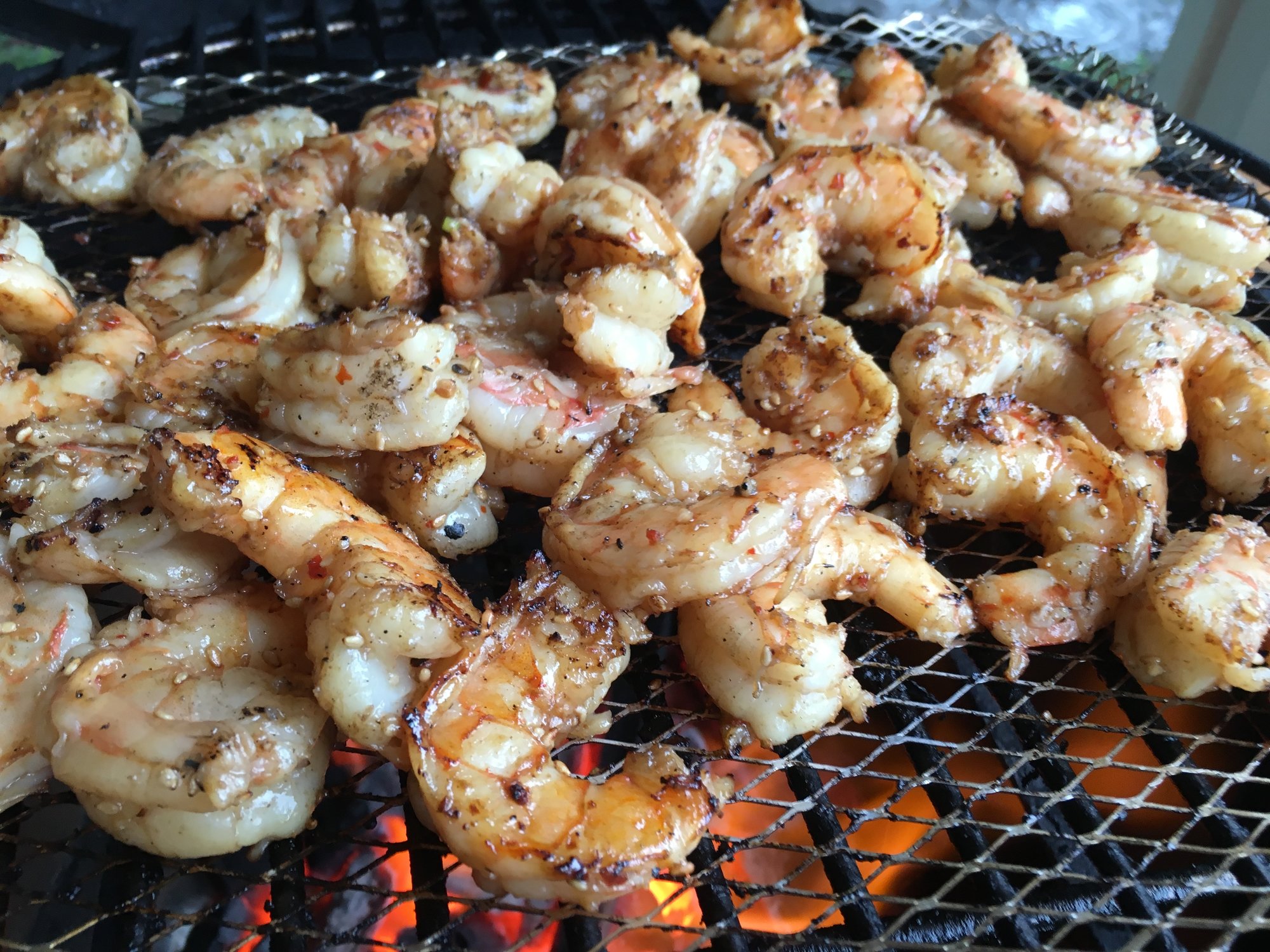 @PASmoke the marinade was dark sesame oil, soy sauce, sake, honey, garlic, ginger, Chinese five spice powder. After it marinated an hour, I pour off, strained and reduced the marinade into a thick sticky sauce that I coated the cooked shrimp with just before serving. I also tossed the shrimp with more dark sesame oil before grilling, and squeezed a little fresh lime before serving.