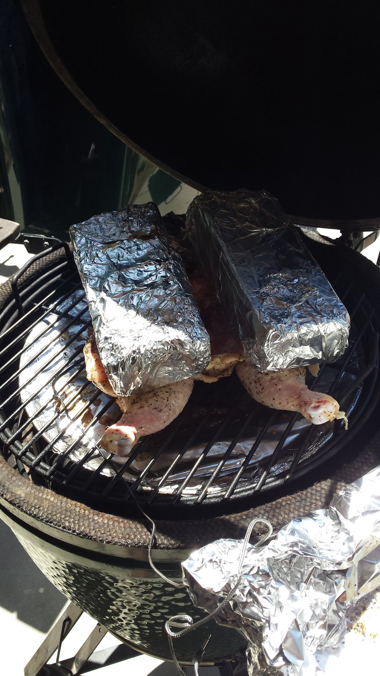 Got the egg up to temp, about 375-400 in-direct, I placed the chicken skin side down, put two freshly foil firebricks on top. I removed the bricks when the temp hit 130 and pulled when the temp hit 158 - The end result was a chicken evenly cooked and nicely crisp skin, the result of the bricks