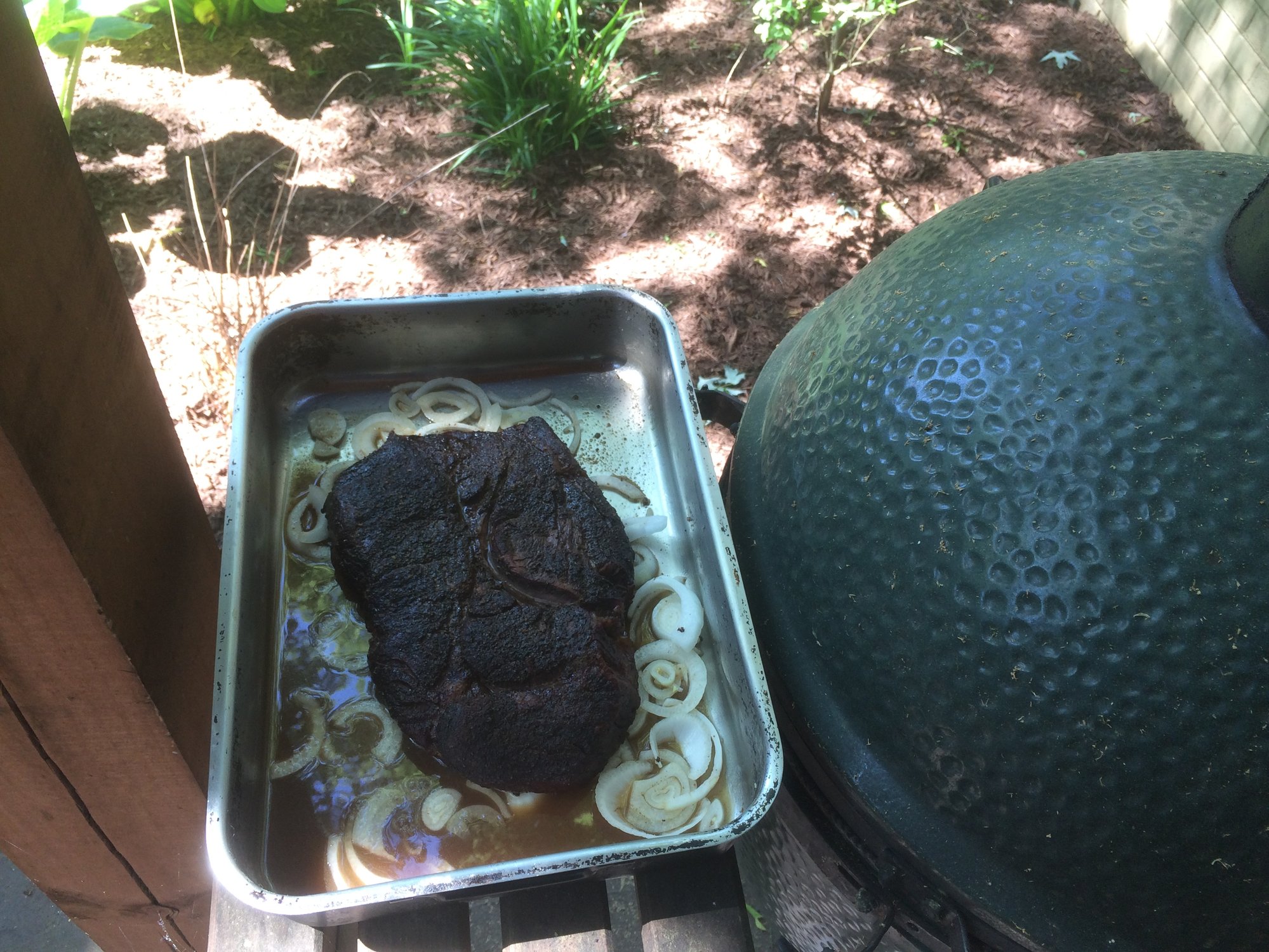 Started the fire this morning at 4:00 with oak lump charcoal and oak chips. Brisket was a 7 lb choice cut from H-E-B. Indirect for 2 hours to set a good smoky flavor base. Put in foil pan at 6:30 and added 2 bottles of Dos Equis Lager, 1 cup water, sliced onions, garlic, and a touch more salt and pepper. Covered the pan and let the magic begin. Had to pull from the egg at 11:30 and finish in the oven because a rain shower came in and extinguished the fire on my open pit that I was going to cook fajitas on. Put brisket in oven and ran 2 rounds of fajita chicken and steak on the egg. Pulled the brisket at 12:30 and it was fall apart tender and absolutely delicious. Mom and my grandmother just raved about it.