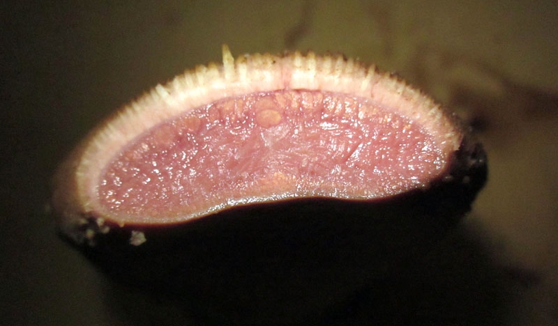 If you want smoked tongue, the outside skin, some of which is about as coarse as sand paper, must be removed. Even cooked, it is too tough, and the smoke doesn't penetrate much. Here's a shot of a tip cross section.