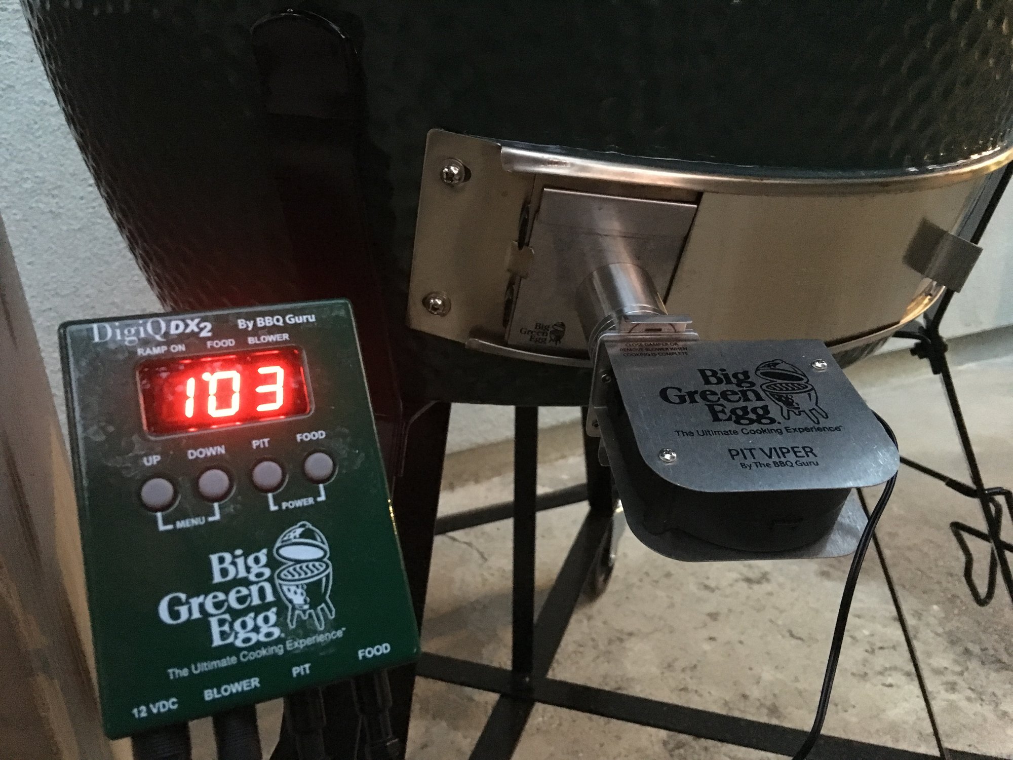 Setup BGE for indirect cooking... ConvEGGtor (legs up), drip tray, grill. Setup DigiQ for a cooking temp of 225 degrees and a food temp of 115 degrees.