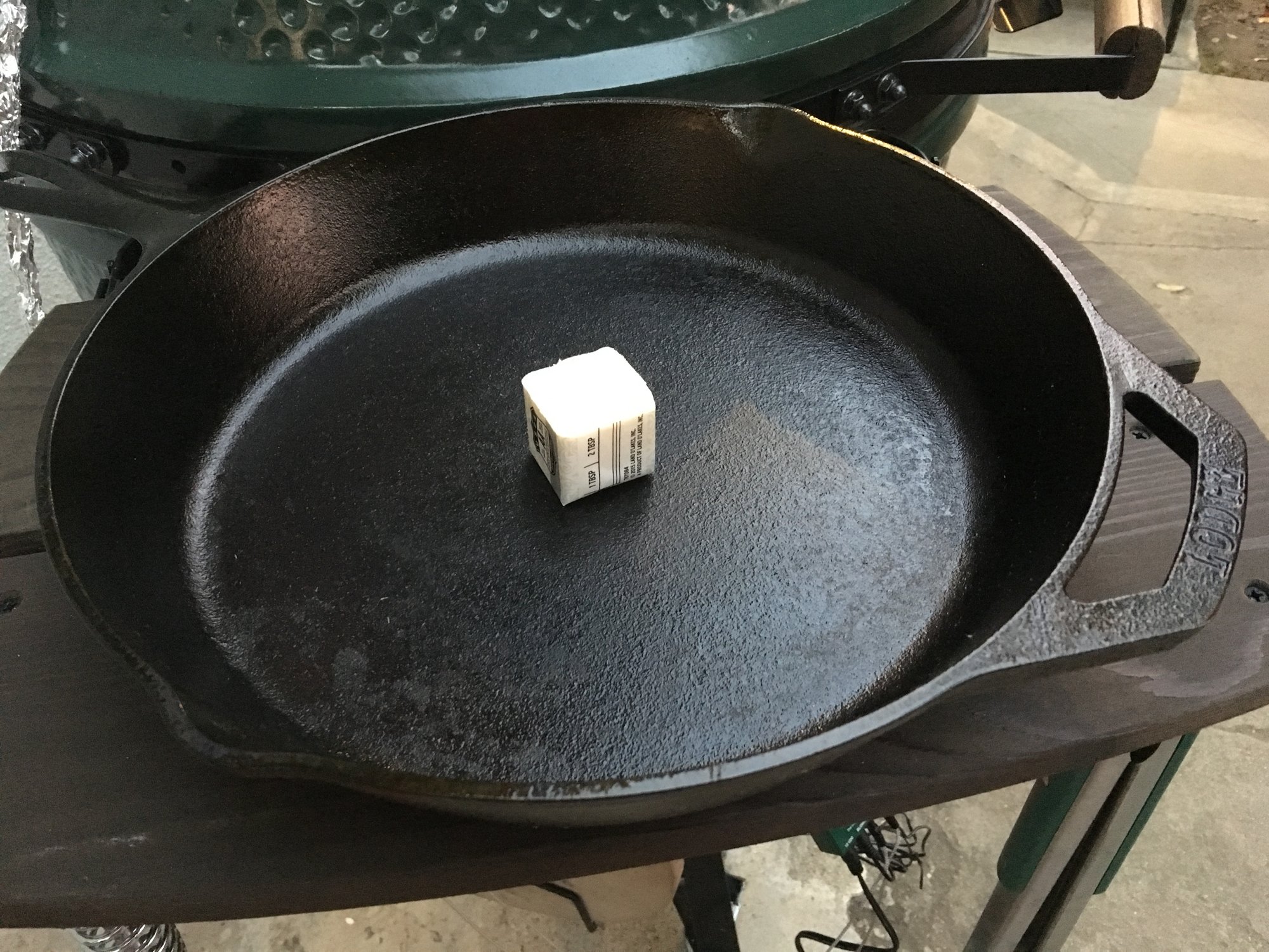After pulling the steaks I removed the grill and ConvEGGtor then put the cast iron pan directly on the coals. I also opened the bottom vent fully (with the screen closed) and took the daisy wheel off. Interestingly enough, this is the first time I was appreciative of the extra room the XL has over the Large. It was nice to have enough space to set the cast iron pan directly on the coals, with plenty of room to spare I might add.