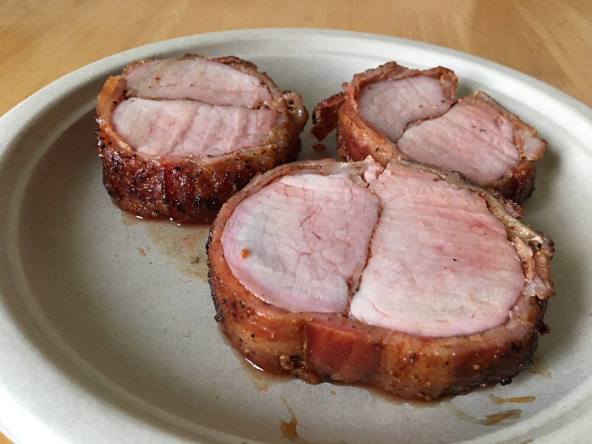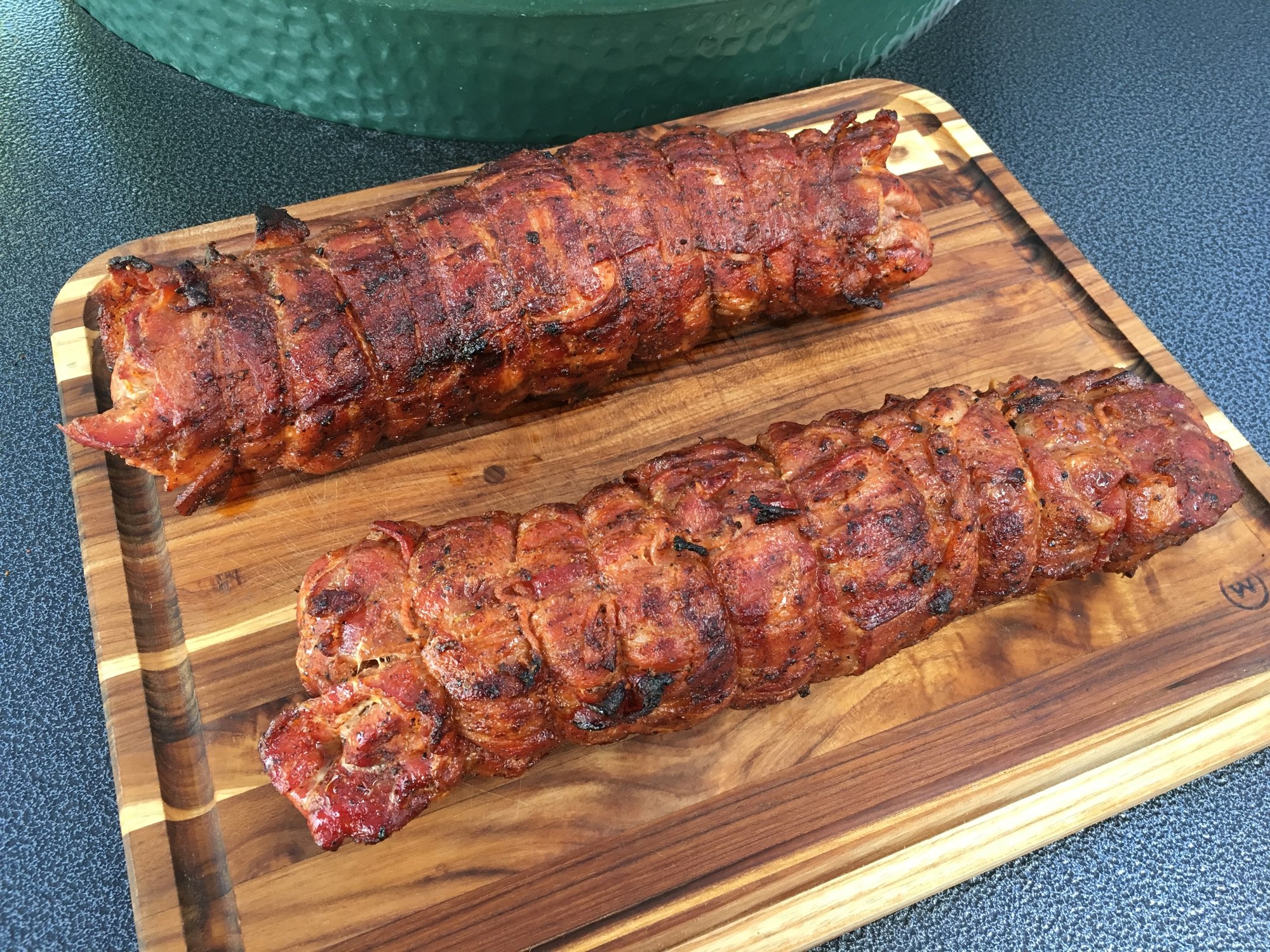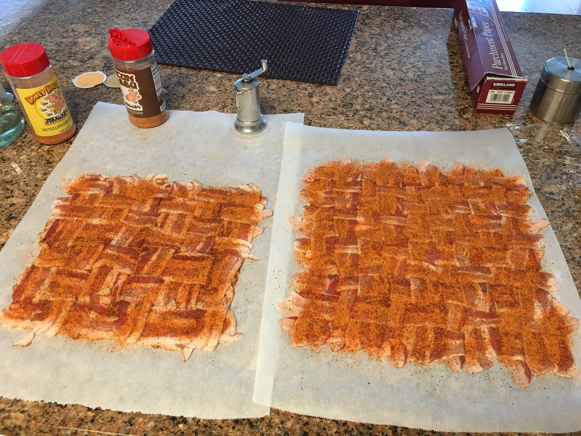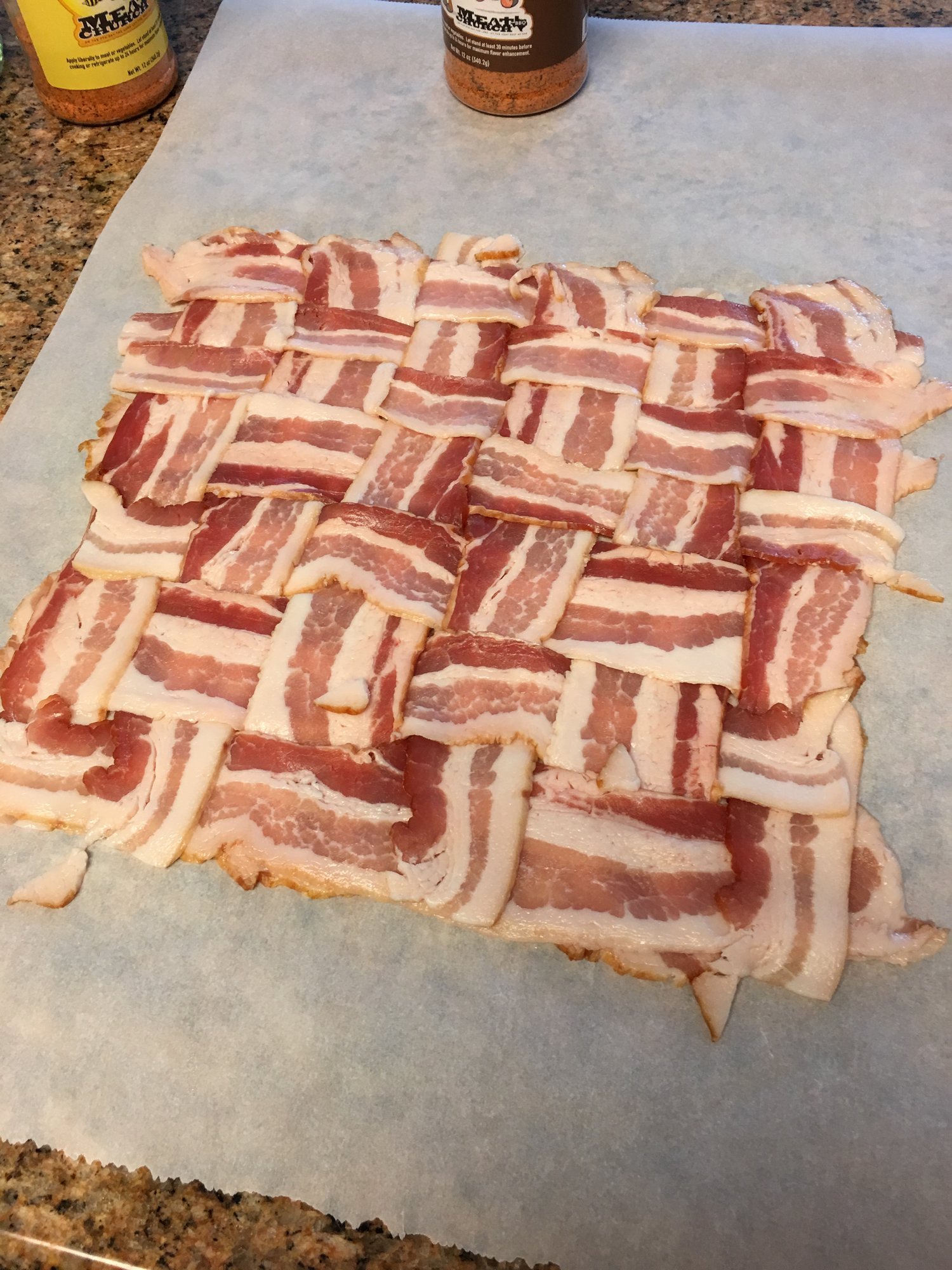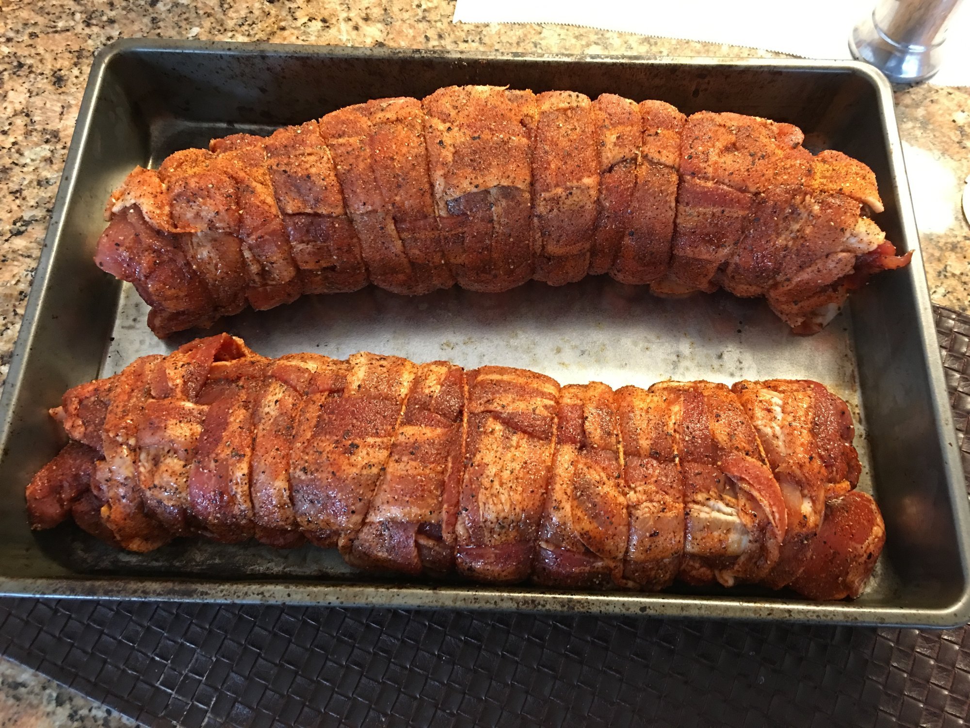 My family loves this so I usually prepare about once per month. Raised direct at 350 on the XL. I used Meat Church Honey Hog + pepper on the pork and Meat Church Bacon BBQ + pepper on both sides of the bacon weave.