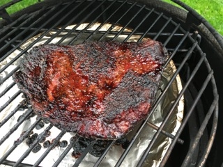Four hours later, at 3:00, IT was only 150, and now it's becoming clear it may not be done in time for dinner, so I bumped up the Egg to 325. When the severe thunderstorm hit 45 minutes later, the winds actually bumped the temp up to 375, and I let it stay there. At 5:45. IT was 205, and the probe went in pretty easily (except the real thin parts on the end, which were pretty crisp).