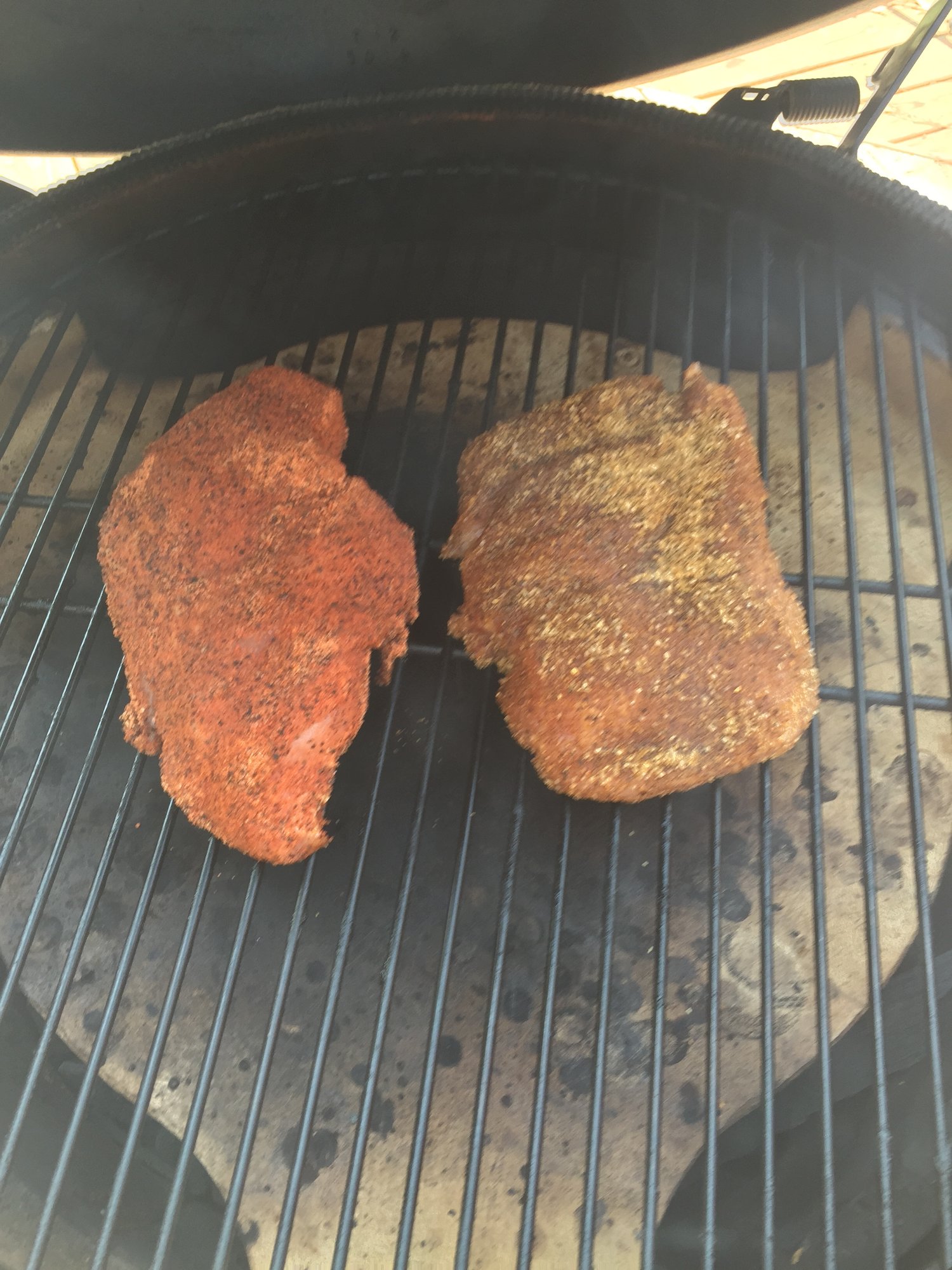Use your favorite rub liberally. And put on the smoker skin side up at ~265F. In this case I used MCs Holy Cow and DPs Shaking the Tree
