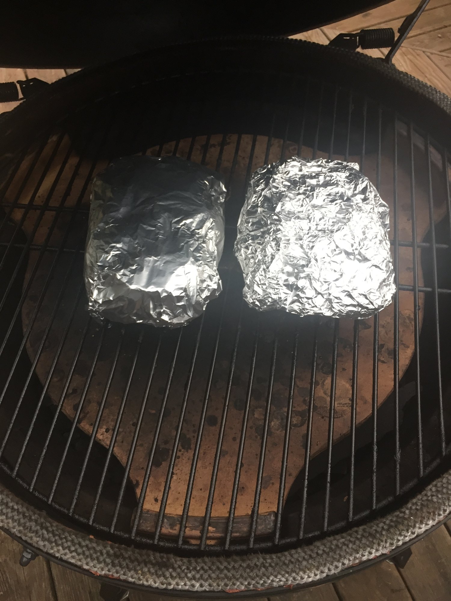 After it it gets to a nice golden color, ~2 1/2 hours, wrap in foil with a cup of butter.