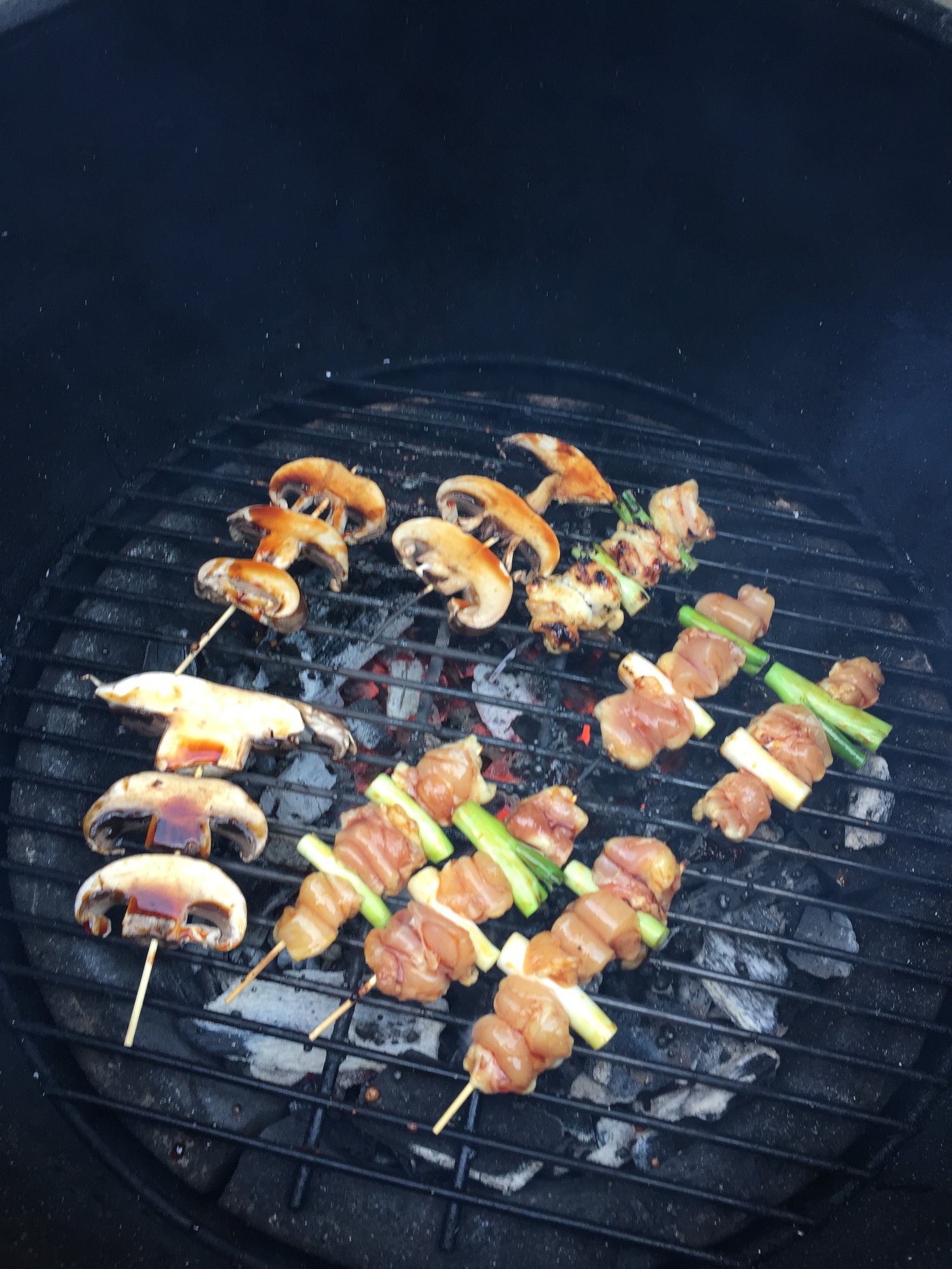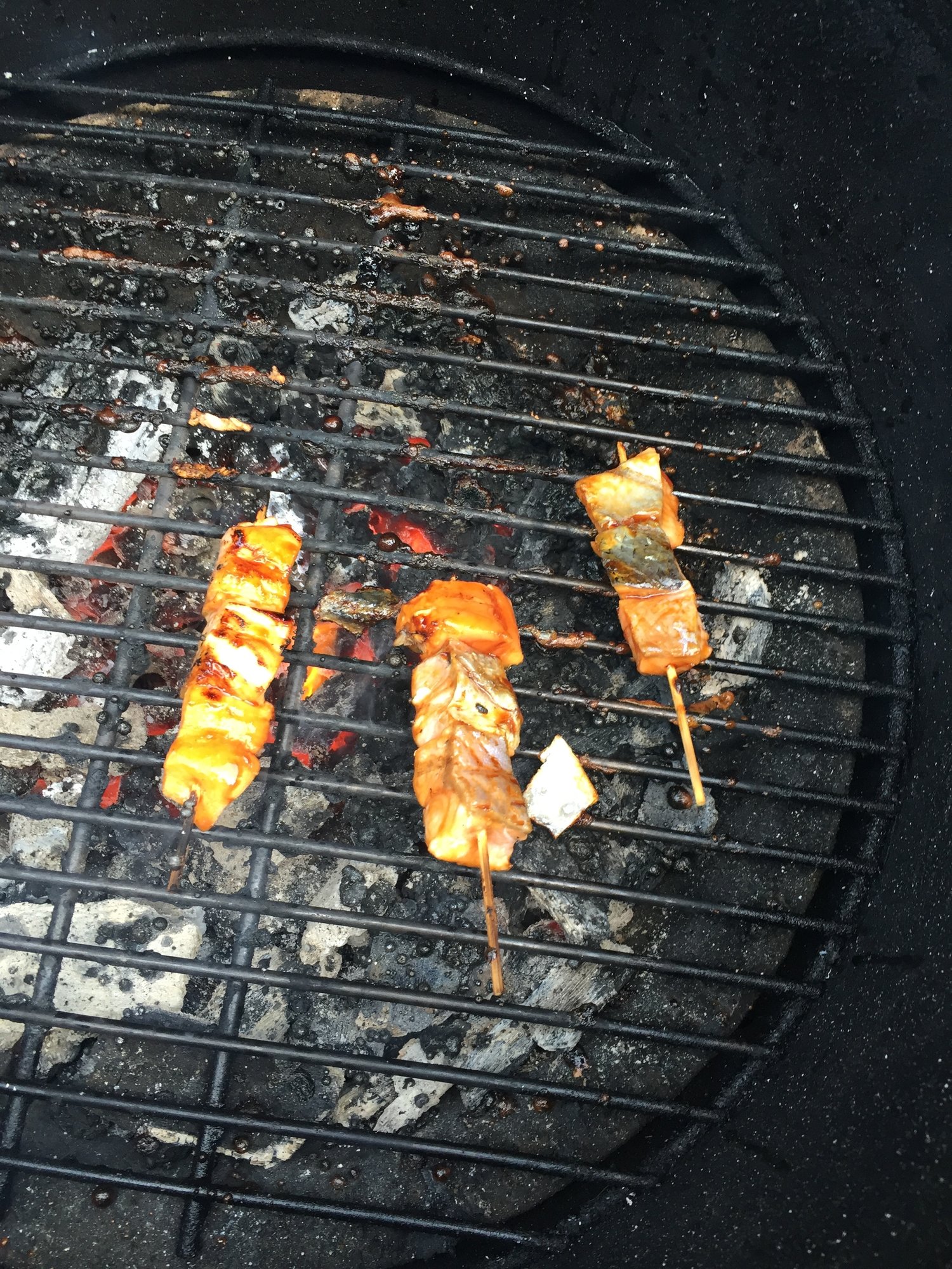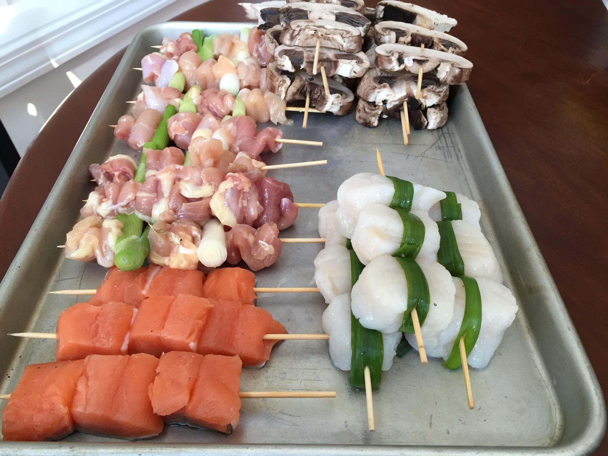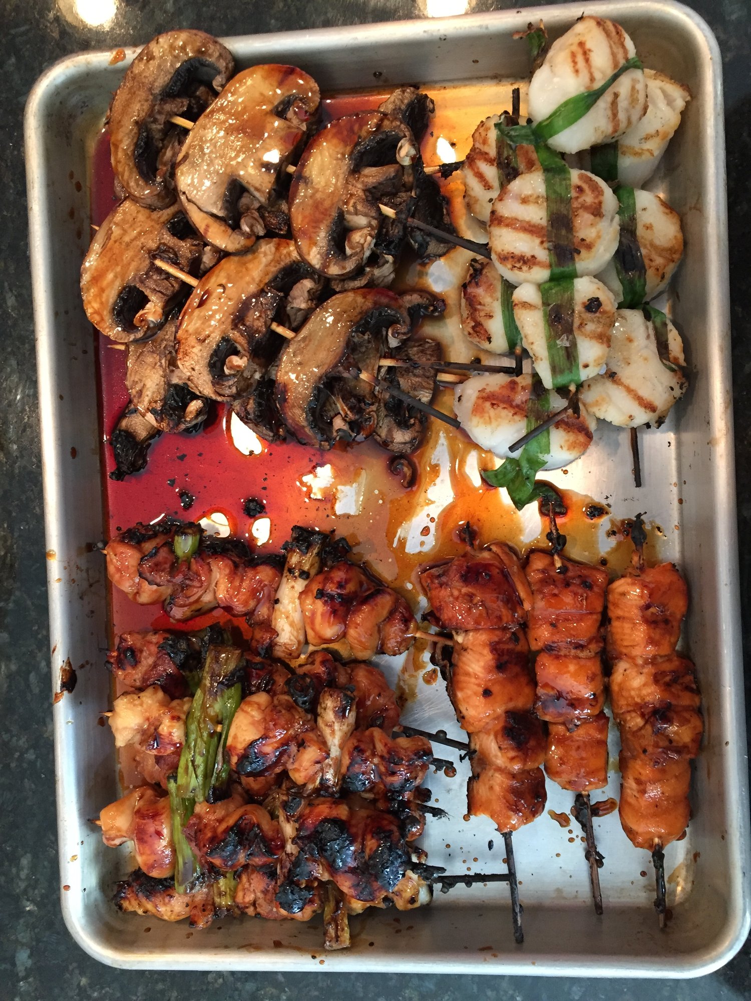 Looked through the fridge this afternoon to figure out what to do for dinner and doing a little of everything. Some chicken thighs, scallops, and salmon. Decided to try an attempt at Japanese Robata/yakitori. I think it turned out pretty well. Next time I need to do a miso butter or something in addition to the teriyaki.