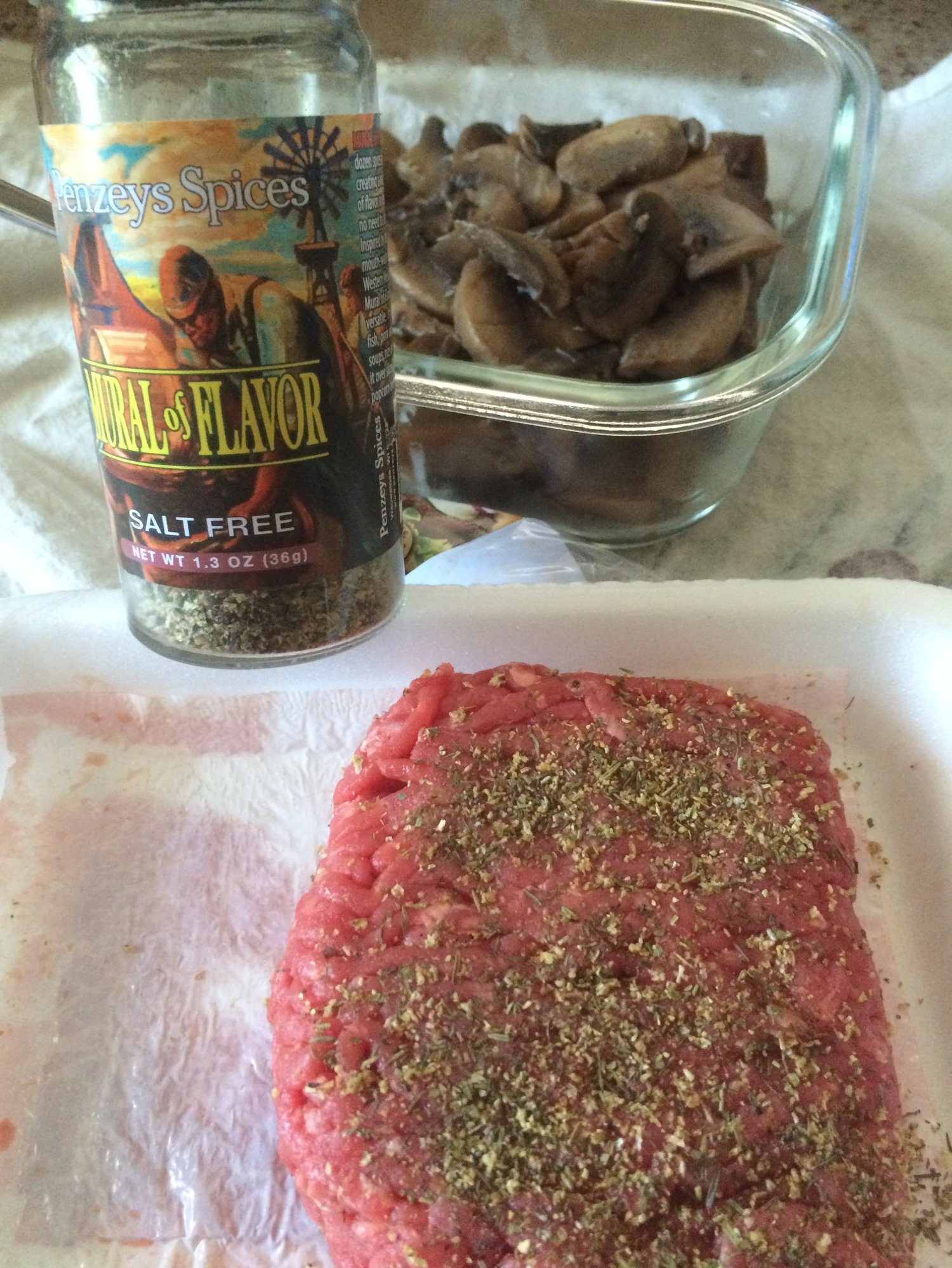 My little tiny frying pan holds a perfect side of mushrooms and onions, some sliced taters peppered on that non stick foil, a generous sized burger minimally handled from the 1 lb package and dusted with salt free seasoning from Penzey's. (Mural of Flavor)