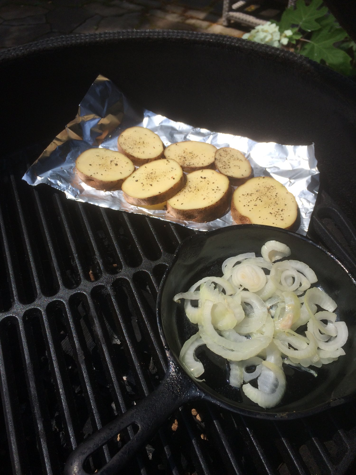 First, the onions need to reduce down to translucent and the taters are peppered on non stick foil.
