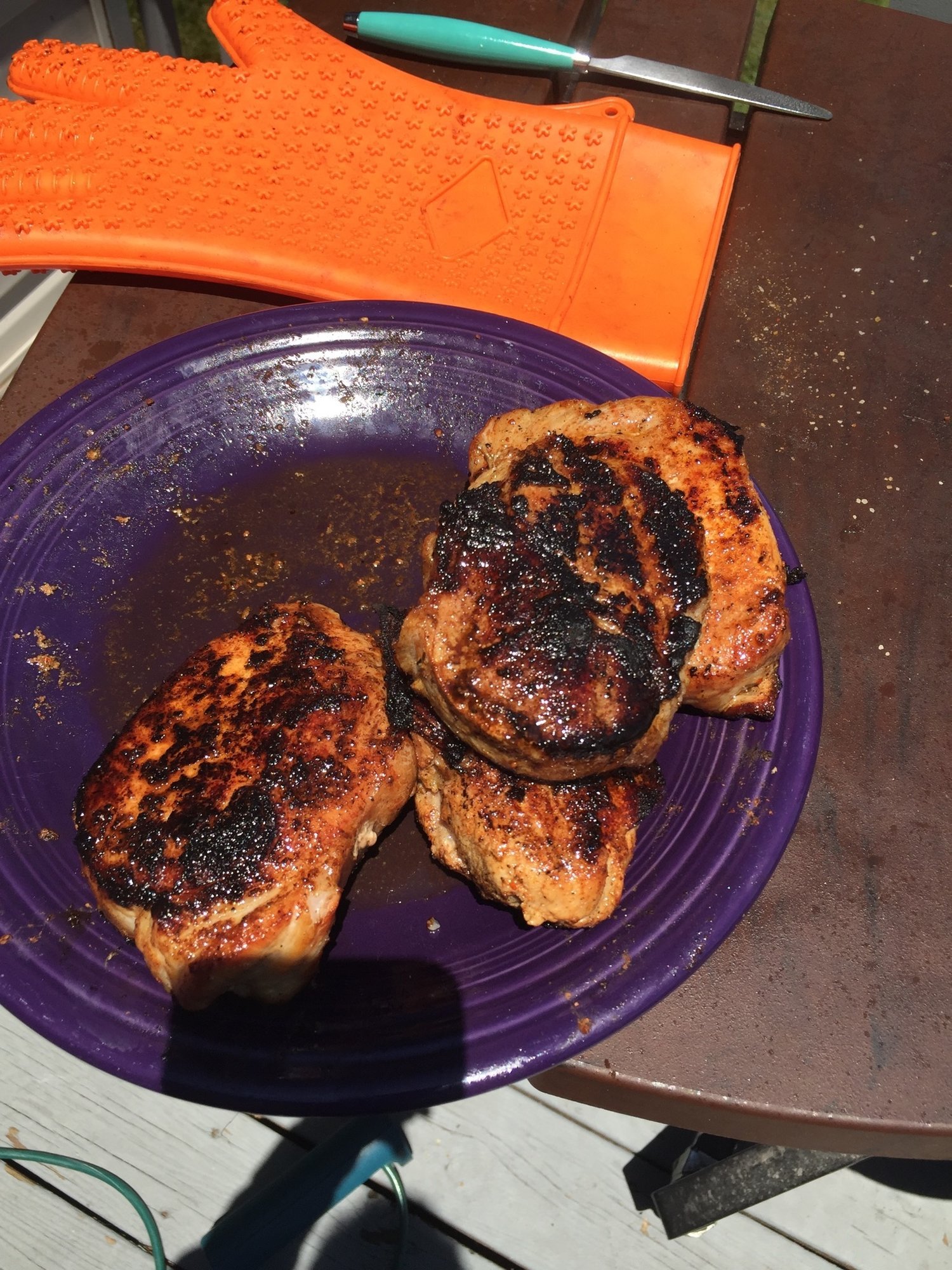 I took the chops indoors to rest and tented with foil while I opened my vents up on the egg and put my cast iron on the grate, got my cast iron skillet over 600 degrees. I put the porkchops on around 650 with butter in the pan seared 1 minute each side. Had a perfect char and couldn't believe how amazing the taste was. Can't wait to try them again.