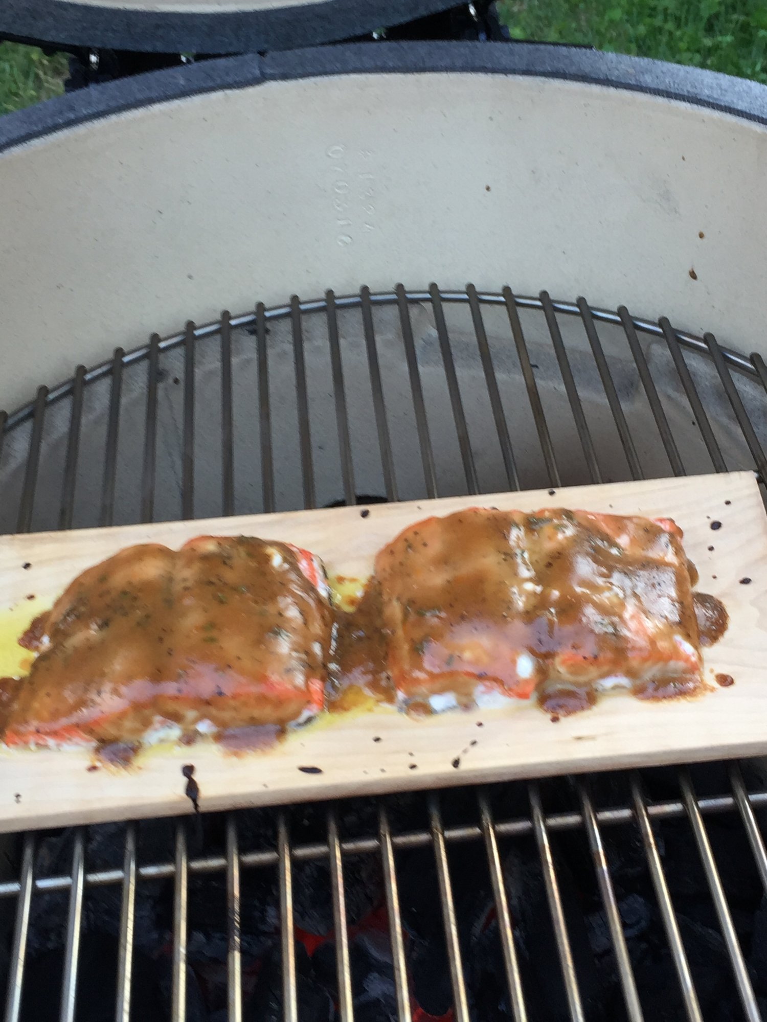 Thanks for the replies - "learn to regulate temp with one brand first" sounds like brilliant advice. So far I seem to be consistently over; learning the hard way how slow the BGE cools down! Since you asked for pictures, here are the first two cooks after a couple of temperature setting/holding trials without cooking (photos complete with utensils). Chef Randy's smoked Spanish chicken (with a local Helles substituted for Landshark, hot chorizo under the skin) and Cedar Plank Salmon with Honey Glaze (got a bit carried away with the glaze). Had the fresh Greek salad with both. Not the two prettiest meals ever but they tasted wonderful!