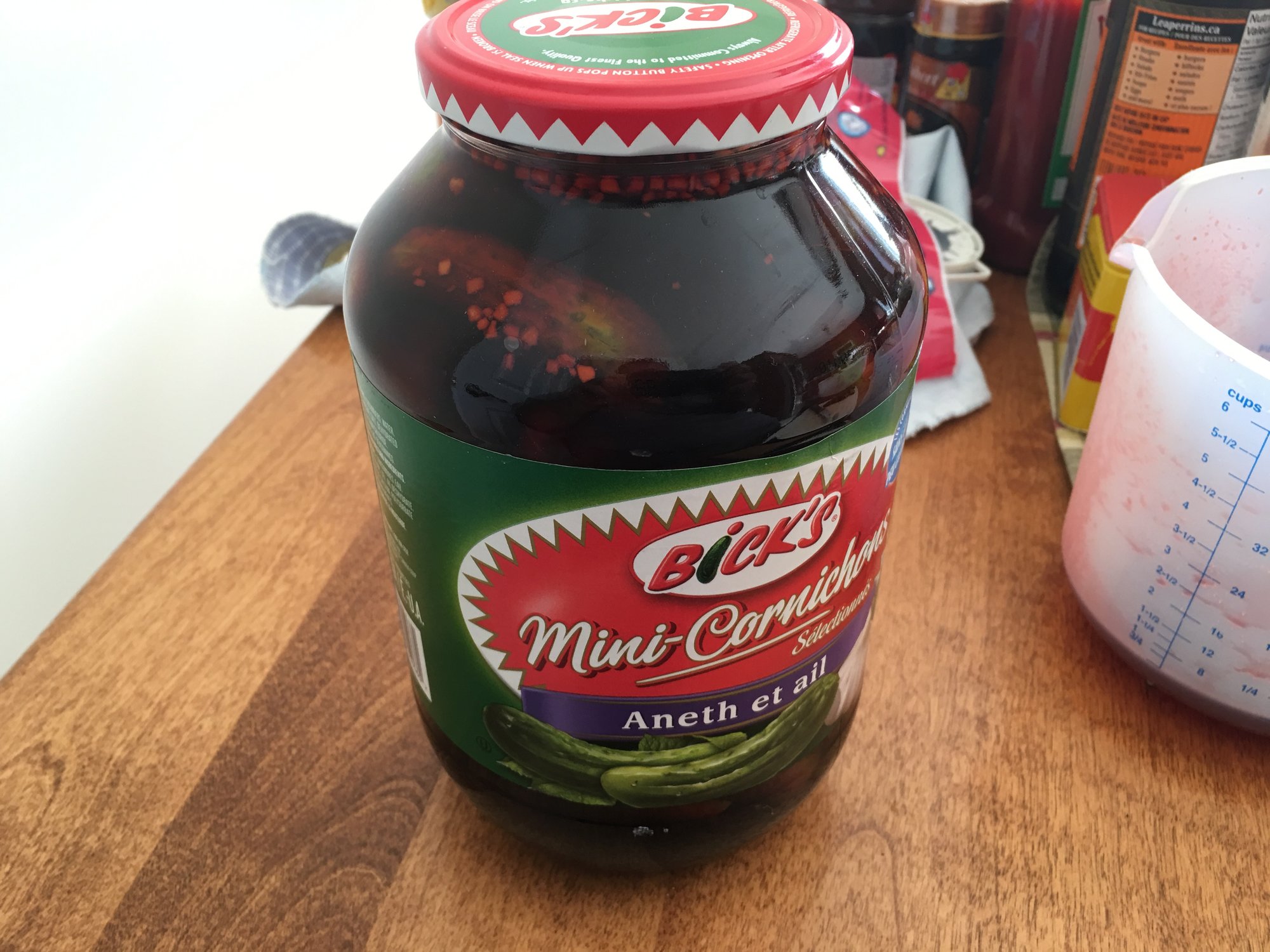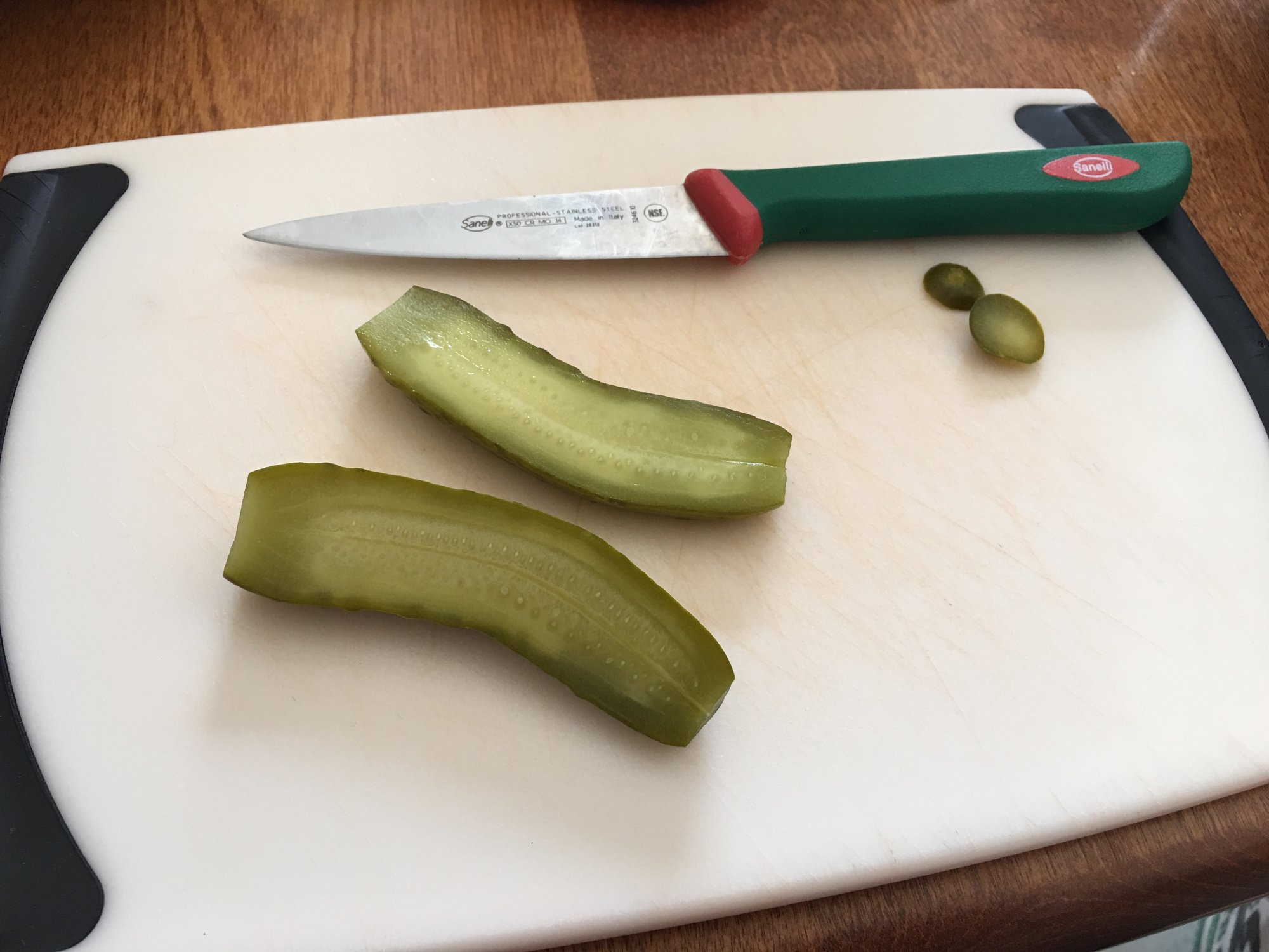 -Remove the pickles from the jar and slice them in half (I also remove the tips)