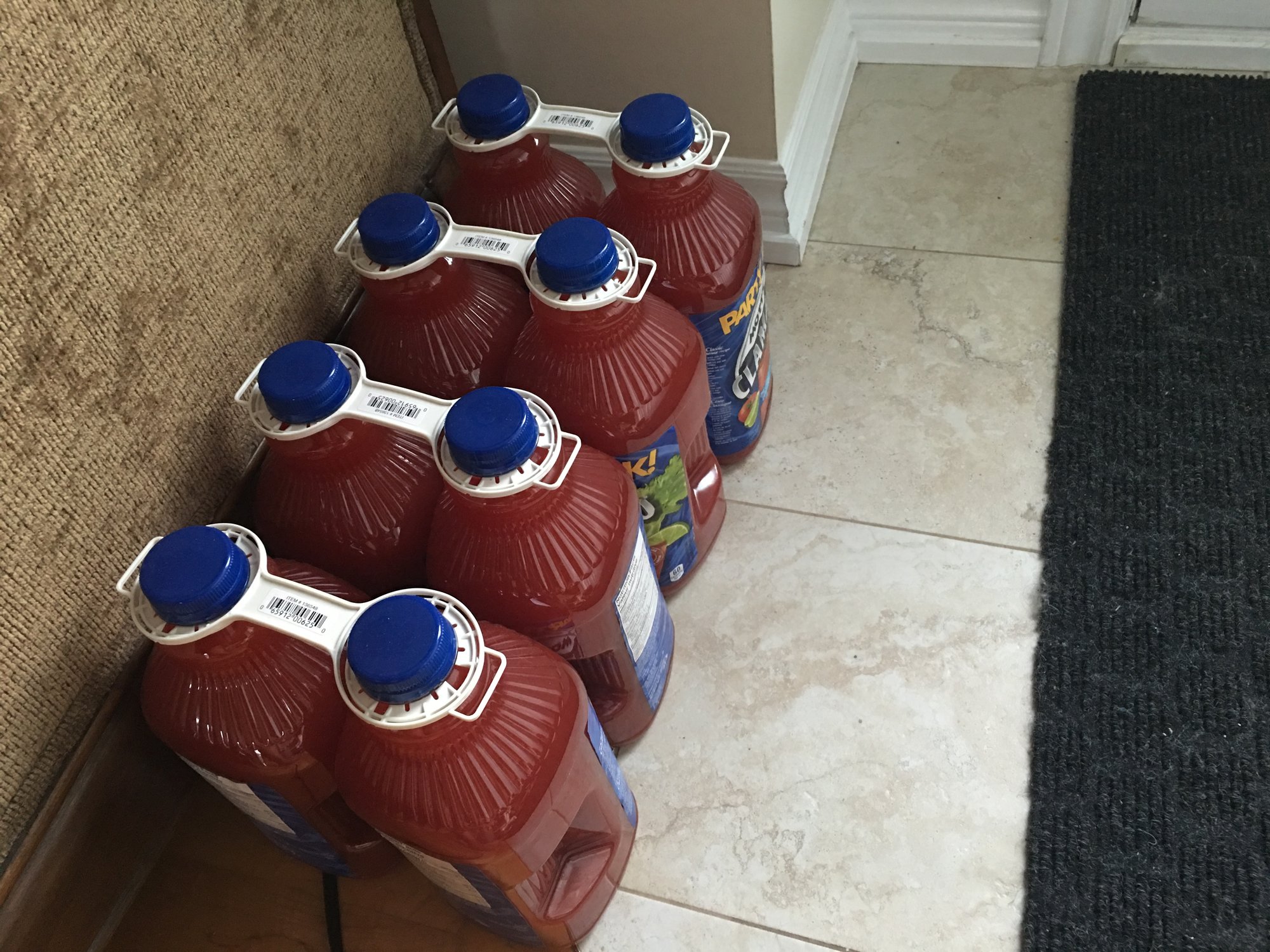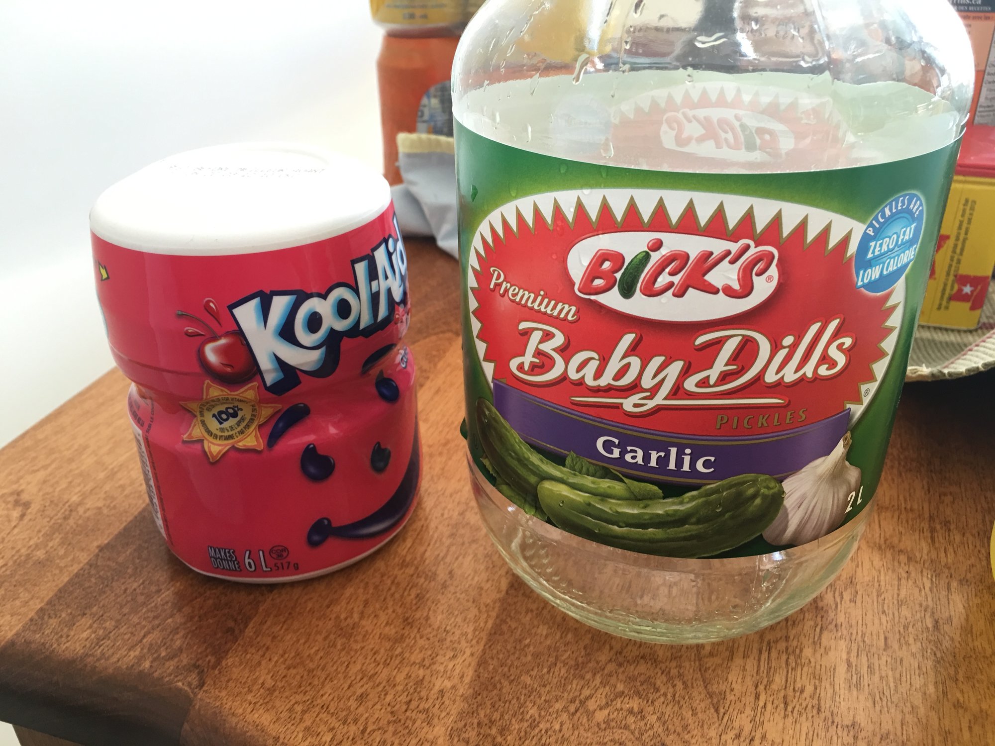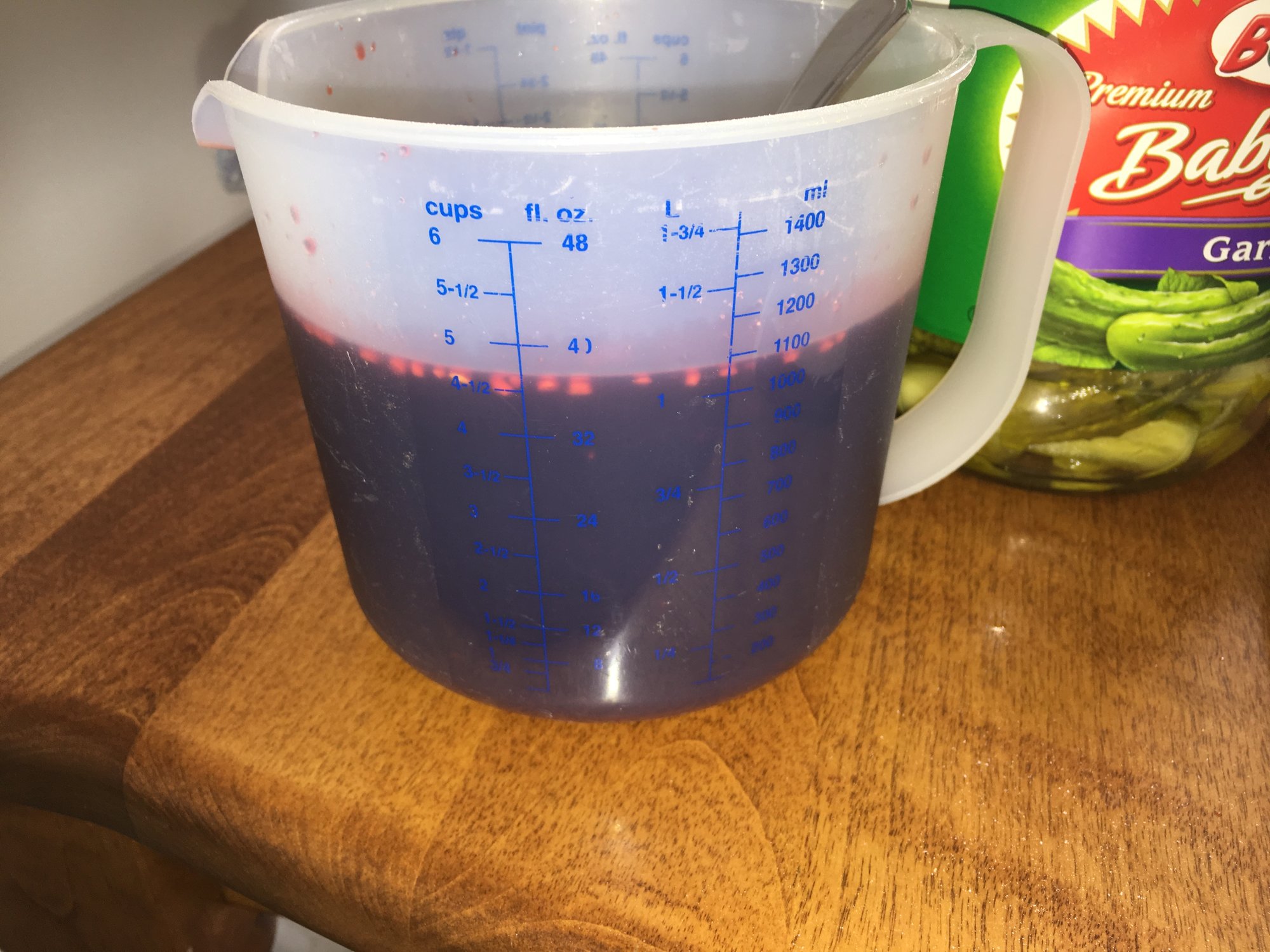 -Mix the 700 ml/24 oz of brine with as much cherry kool-aid mix as it will take. I used a full jar of mix (enough for 6L/1.5 Gal.). The brine will be dark red and opaque but after a few weeks, it will be slightly translucent.