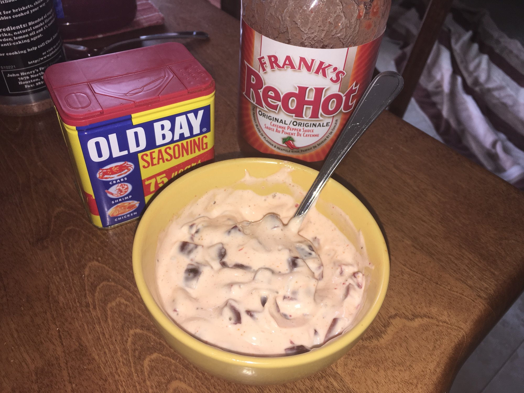 Chopped and mixed with mayonnaise, red hot sauce and Old Bay seasoning. The best (and strangest burger sauce ever). I just finished my last jar of Old Bay... So sad.