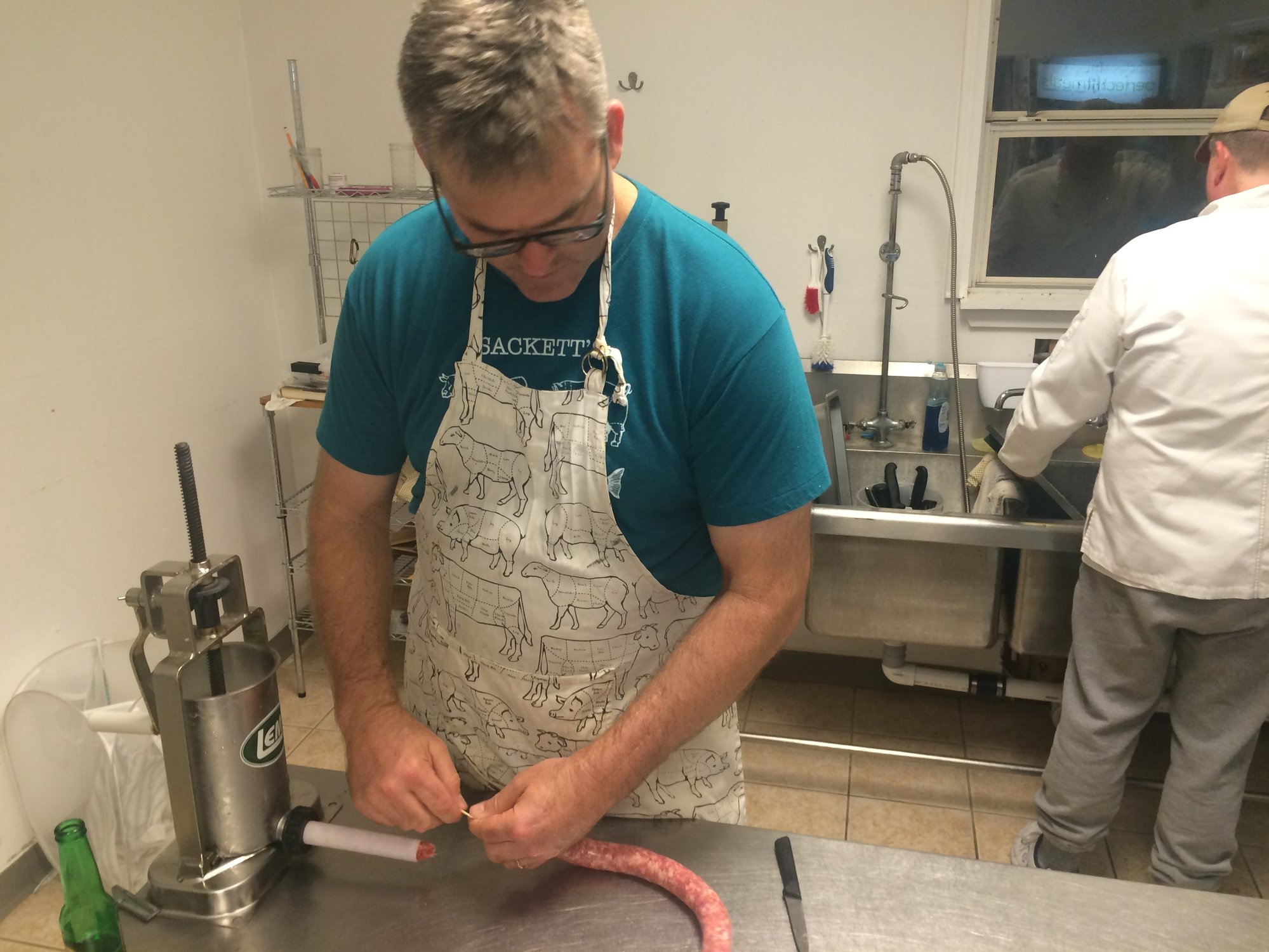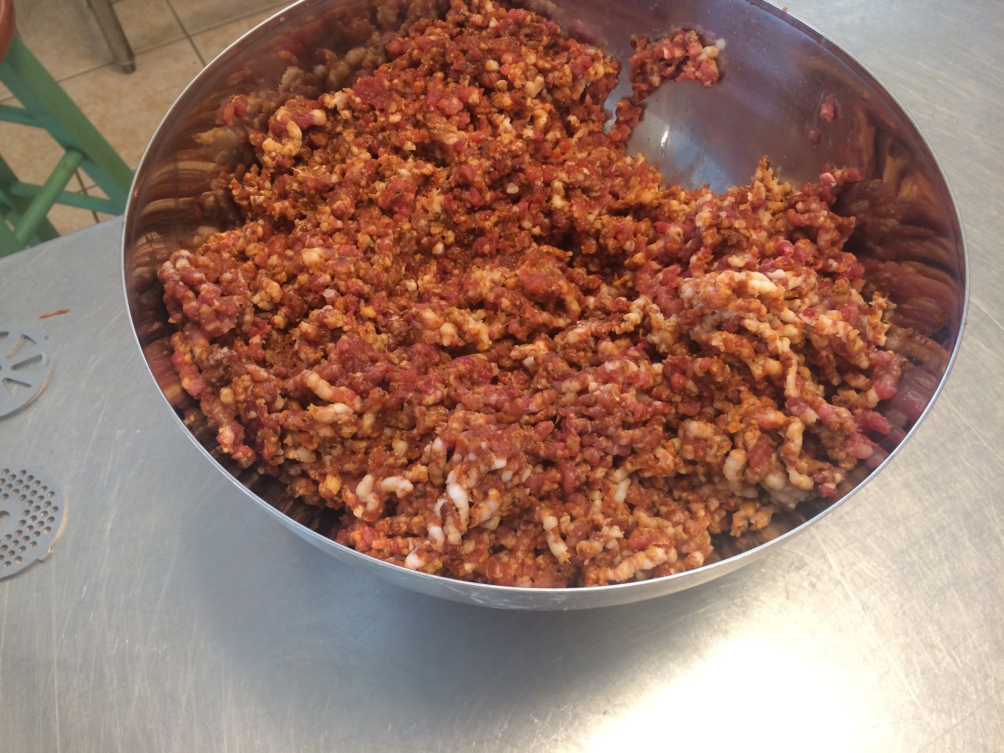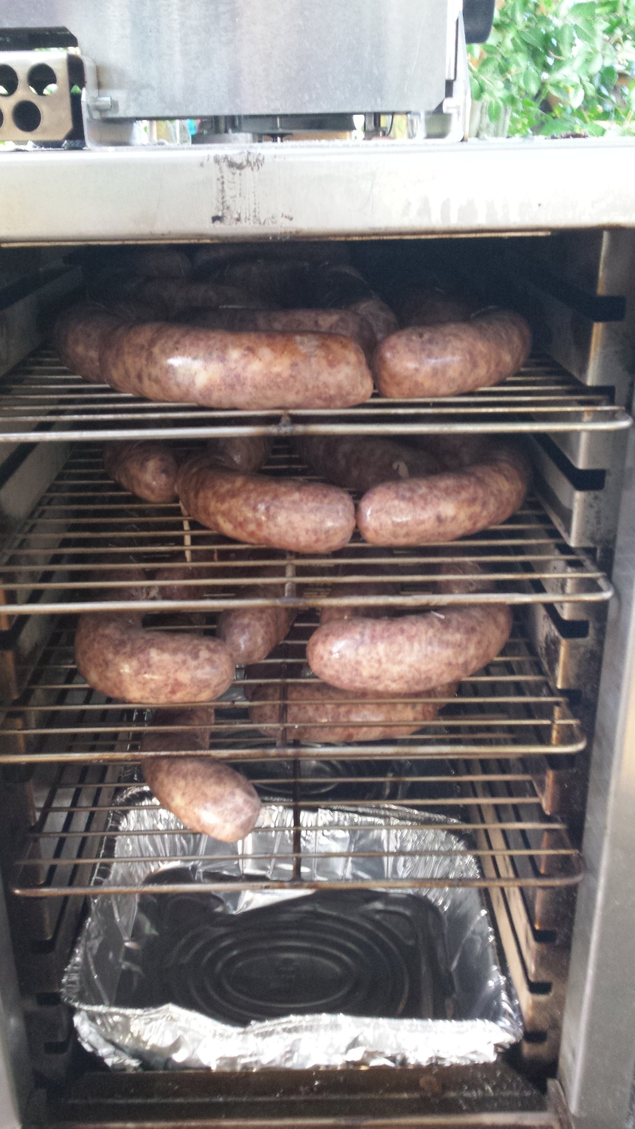 czech style beef and pork sausage. cut fresh from the hog, ground, blended with top round beef from 44 Farms, seasoned, stuffed, and smoked on site with assist from the dishwasher.