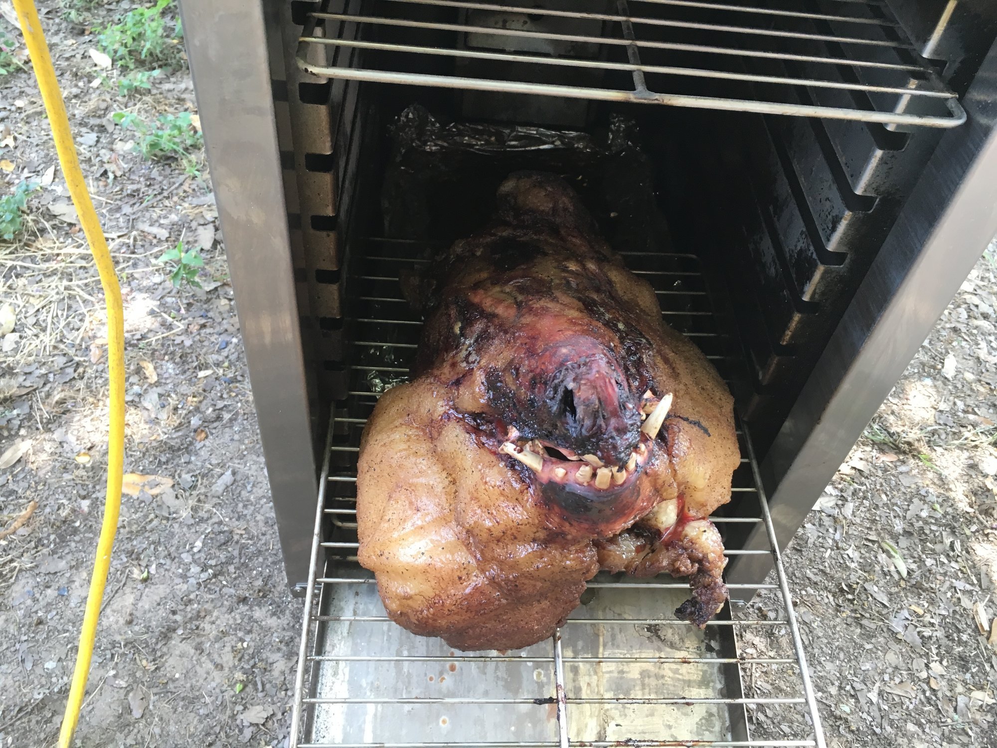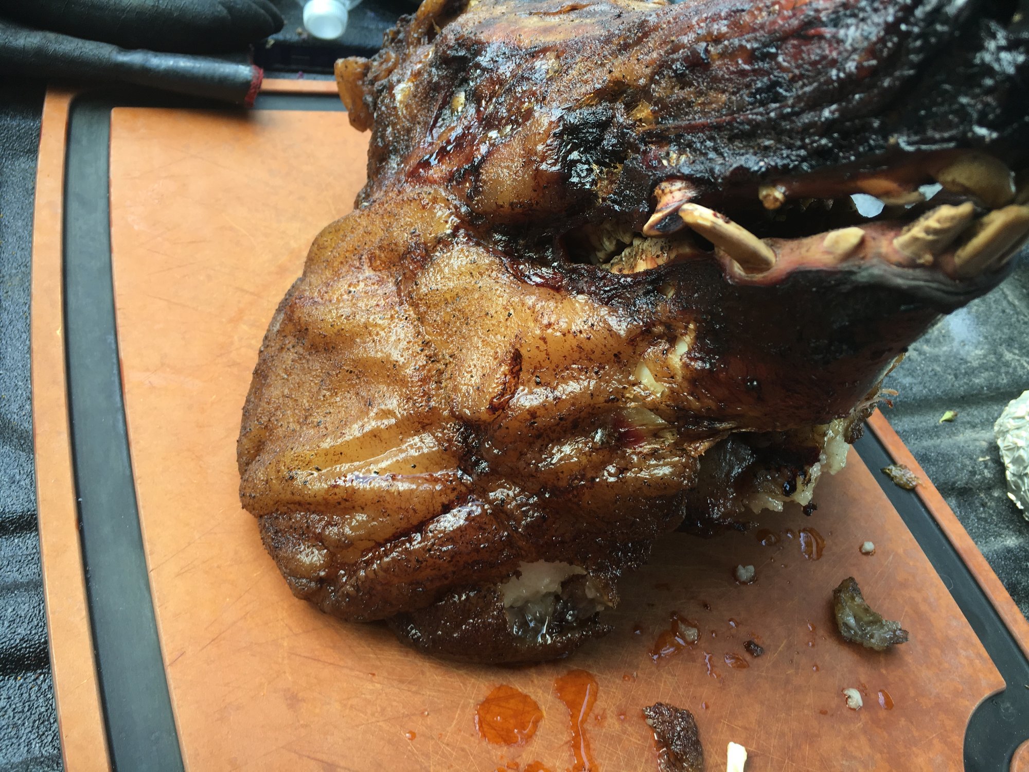 And lastly- if there is a "least appetizing" or "I dare you" category, we submit one more. Whole hog Head in the KBQ. Smoked for 10 hrs then picked at from the bed of a pickup truck with pocket knives, fingers, and tortillas. Looked and tasted a little bit like A much beloved alien TV character from the 80's (No, not Mork you sickos)