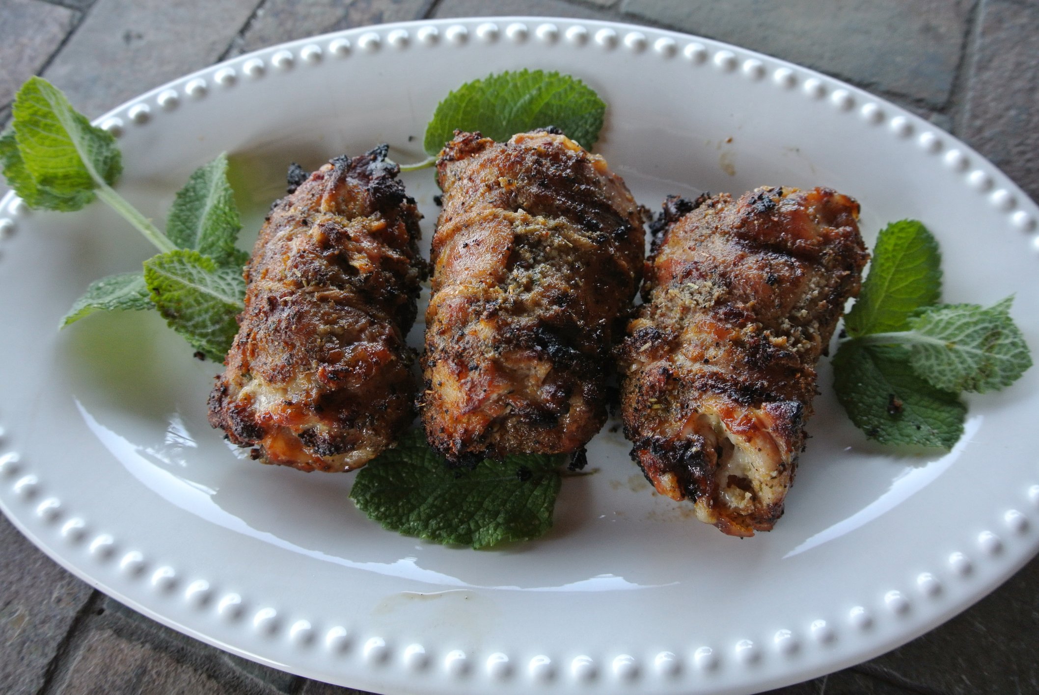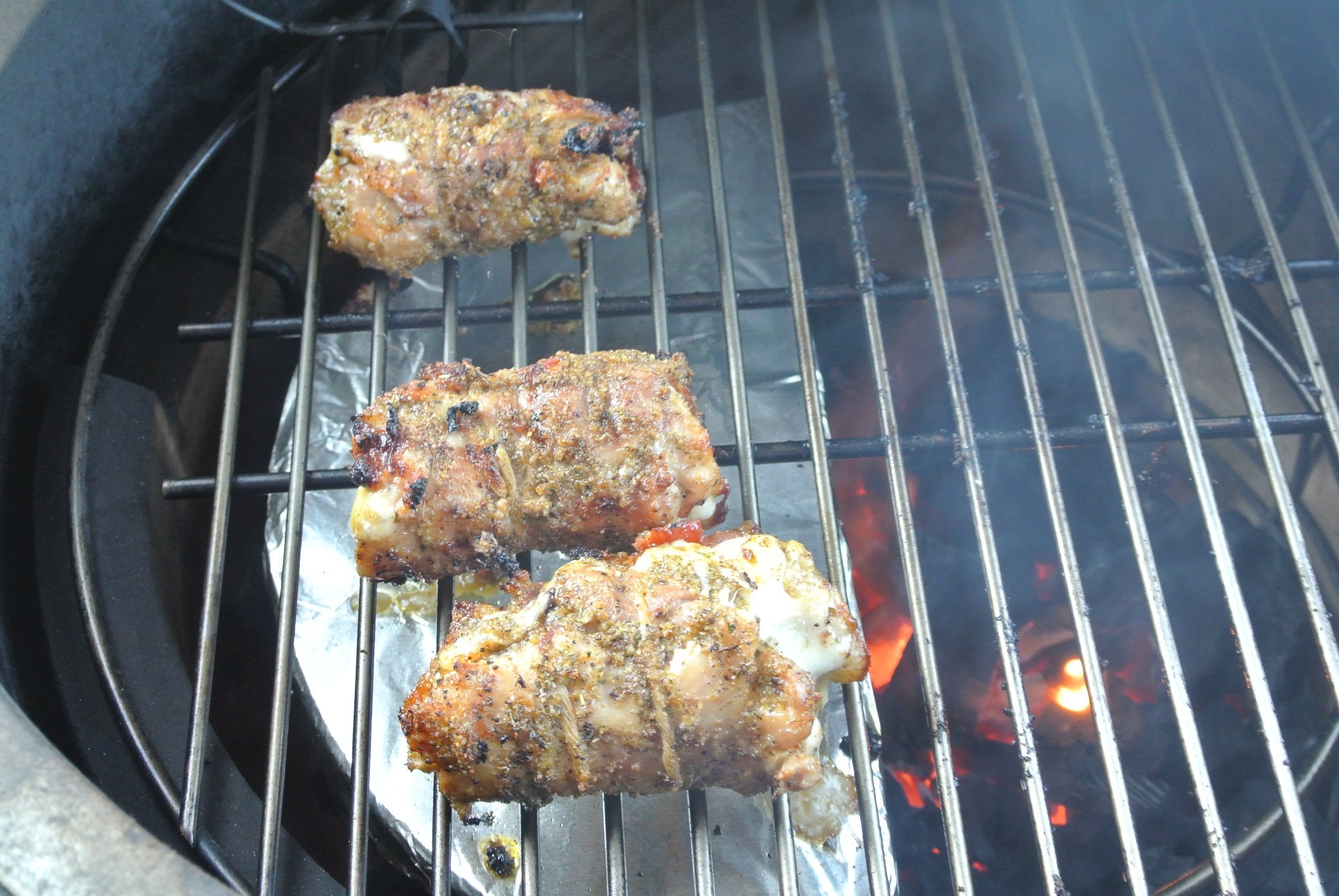 Boneless skinless chicken thighs pounded thin. Stuffed with a slice of Provolone cheese, Proscuitto, and spread with both Italian sun dried tomatoes and olive tapapenade sprinkled with a nice poultry rub. . Cooked on my large using a spider and a 1/2 stone to make a two zone cooking environment. The wife when asked what she wanted for the 4th requested these. Win or go home, they were delicious. Fixed some sliced watermelon with feta, olive oil, balsamic, and shredded mint. Wonderful meal.